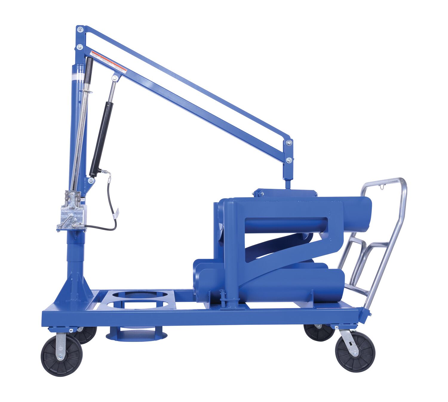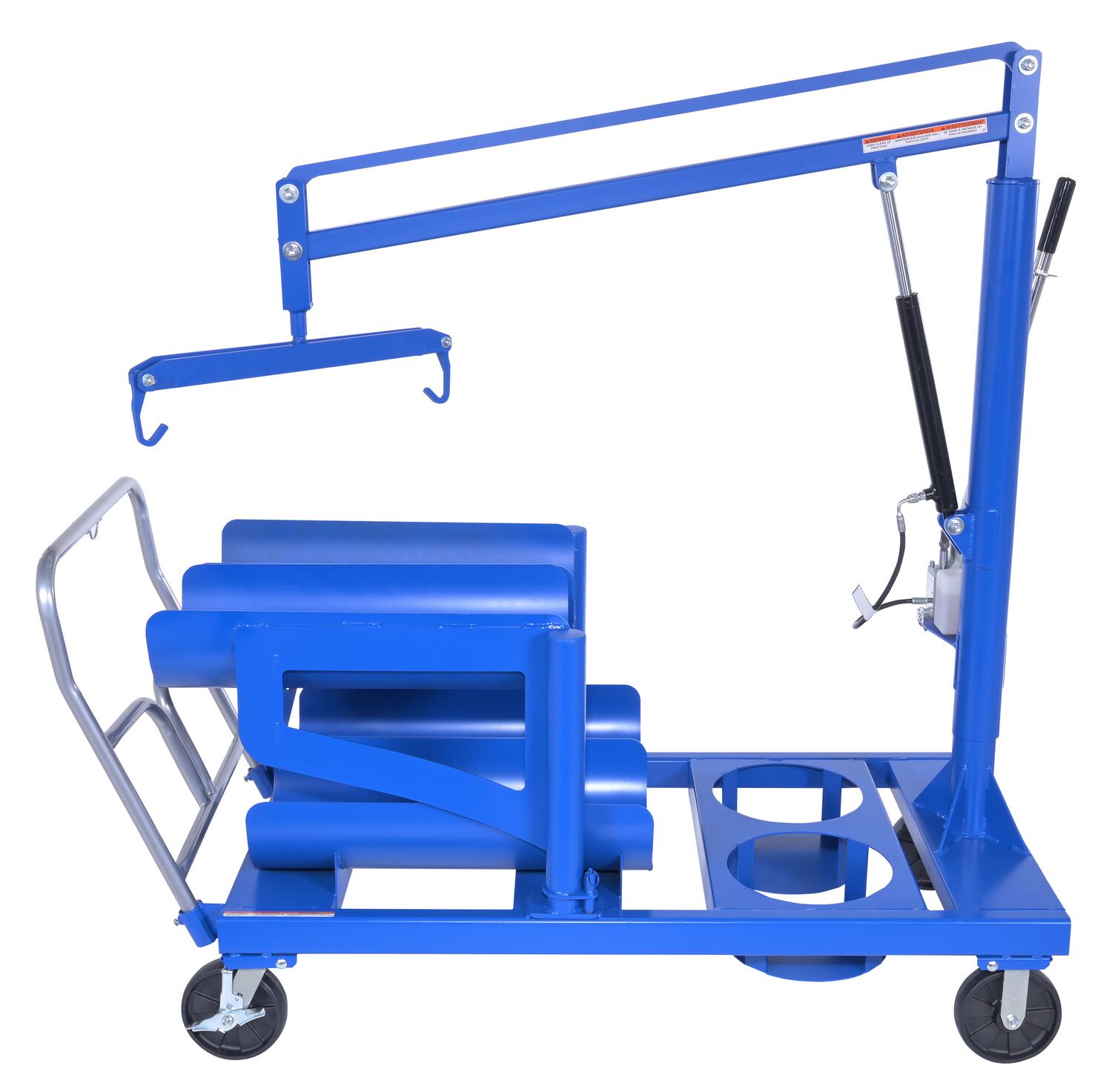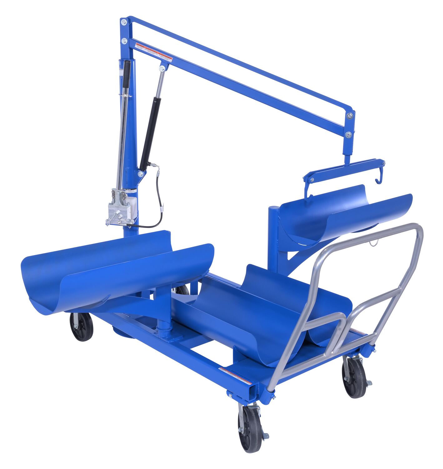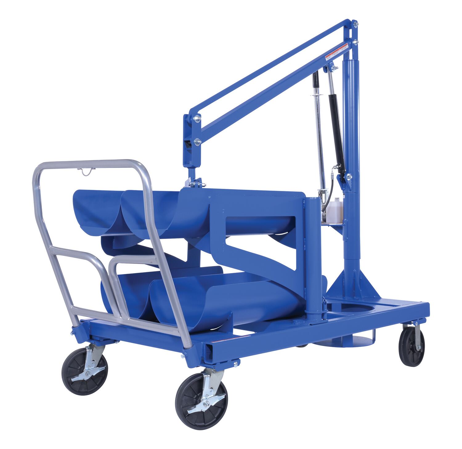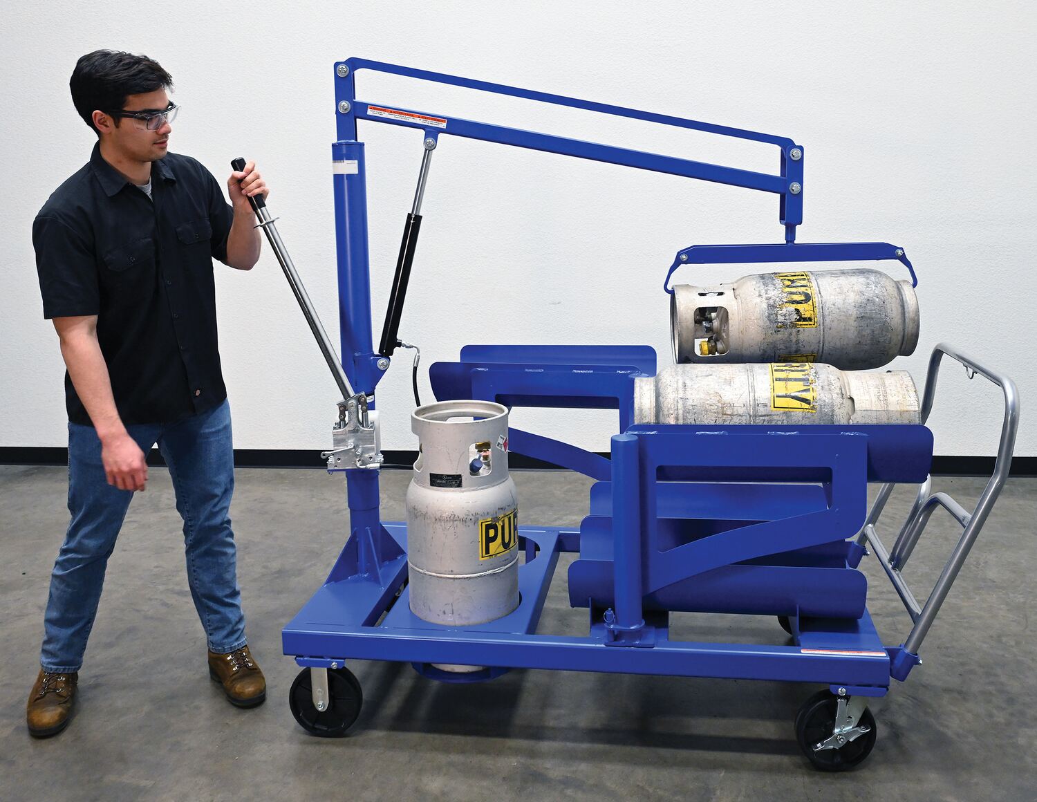 Steel LP Tank Truck 137-9/16 In. x 33-13/16 In. x 97-11/16 In. 6 Tank Capacity BlueFinally an easy answer to lifting, storing, and transporting problems associated with LP tanks. This all-in-one LP tank truck allows users to transport LP tanks where needed. The built-in crane can be used to safely load full tanks into fork trucks. The crane pivots for maximum versatility. The crane boom is raised and lowered with a manual hand pump hydraulic lift. The tank attachment at the end of the boom automatically clamps to each end of the cylinder. The built-in racks are ideal for LP tank storage-racks. Store two (2) tanks in the vertical position and four (4) tanks in the horizontal position. Truck includes a push handle with casters for portability.
