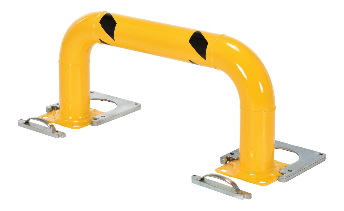 The surface-mounted steel base plates allow for quick and easy removal of this Low Profile Rack Guard. May be used either indoors or outdoors. Steel base plates are bolted in place. Guard is easily inserted into base plates then locked into place. Base plate includes four (4) pre-drilled mounting holes.