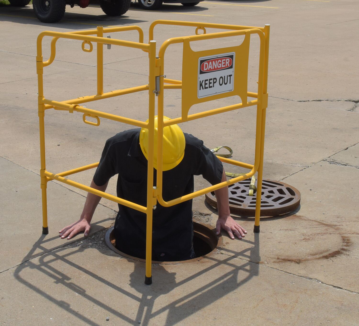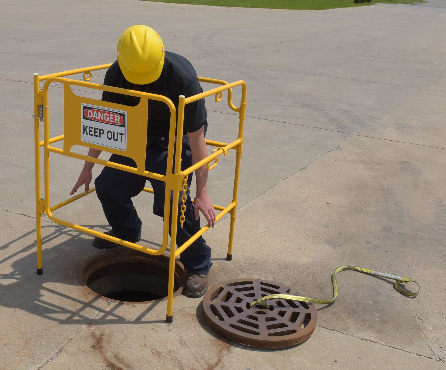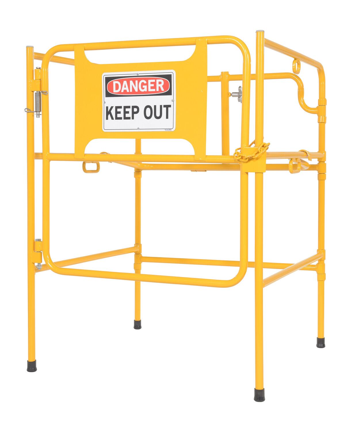Steel Manhole Guard Rail with Aluminum Sign 31 In. x 30 In. Danger Keep Out Sign Message YellowThe manhole guard rail with Aluminum sign is perfect for utility maintenance and city officials. The simple set up and take down promotes quick use when on the go and a compact storage when not in use. High rails and an attaching chain limit access and promote safety to the worker in the enclosed area. A brightly colored high strength construction makes the unit highly visible, giving caution to pedestrians and other workers to keep their distance.
