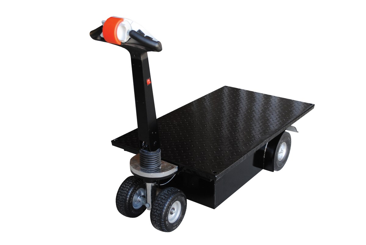 This traction-drive cart features built-in traction-drive system for easy transportability. Ideal for applications including mail rooms, hospitals, supermarkets, hotels and warehouses. Features electric drive motor with batteries for power. Internal battery charger is included. Variable throttle speed control for precise maneuvering and positioning is located in the handle. Speed control is conveniently located in handle. Handle pivots back towards operator and includes horn, automatic brake and emergency stop. Each shelf includes a non-slip tread plate surface. Includes on-board charger and battery level indicator.