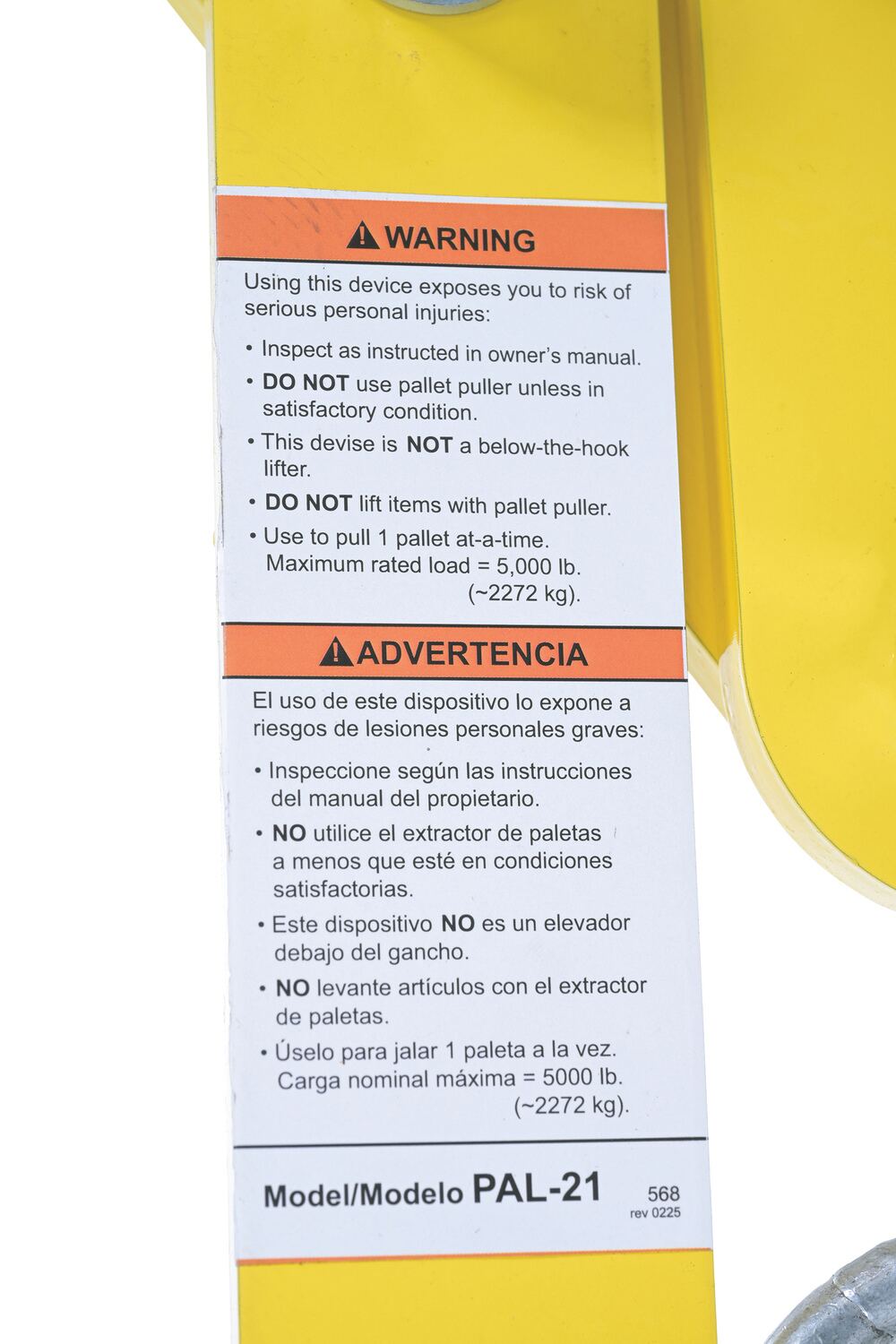 Steel Double Scissor Pallet Puller 4 In. Jaw Opening 5000 Lb. Pulling Capacity YellowThe pallet puller is used to pull pallets to rear of trailers for easy fork truck access. Made of rugged steel construction. Heads are self-cleaning and unaffected by wood particles, paint or grease. The one (1) piece curved heads have integral spurs for gripping pallet stringers. The pallet puller is not designed for lifting.
