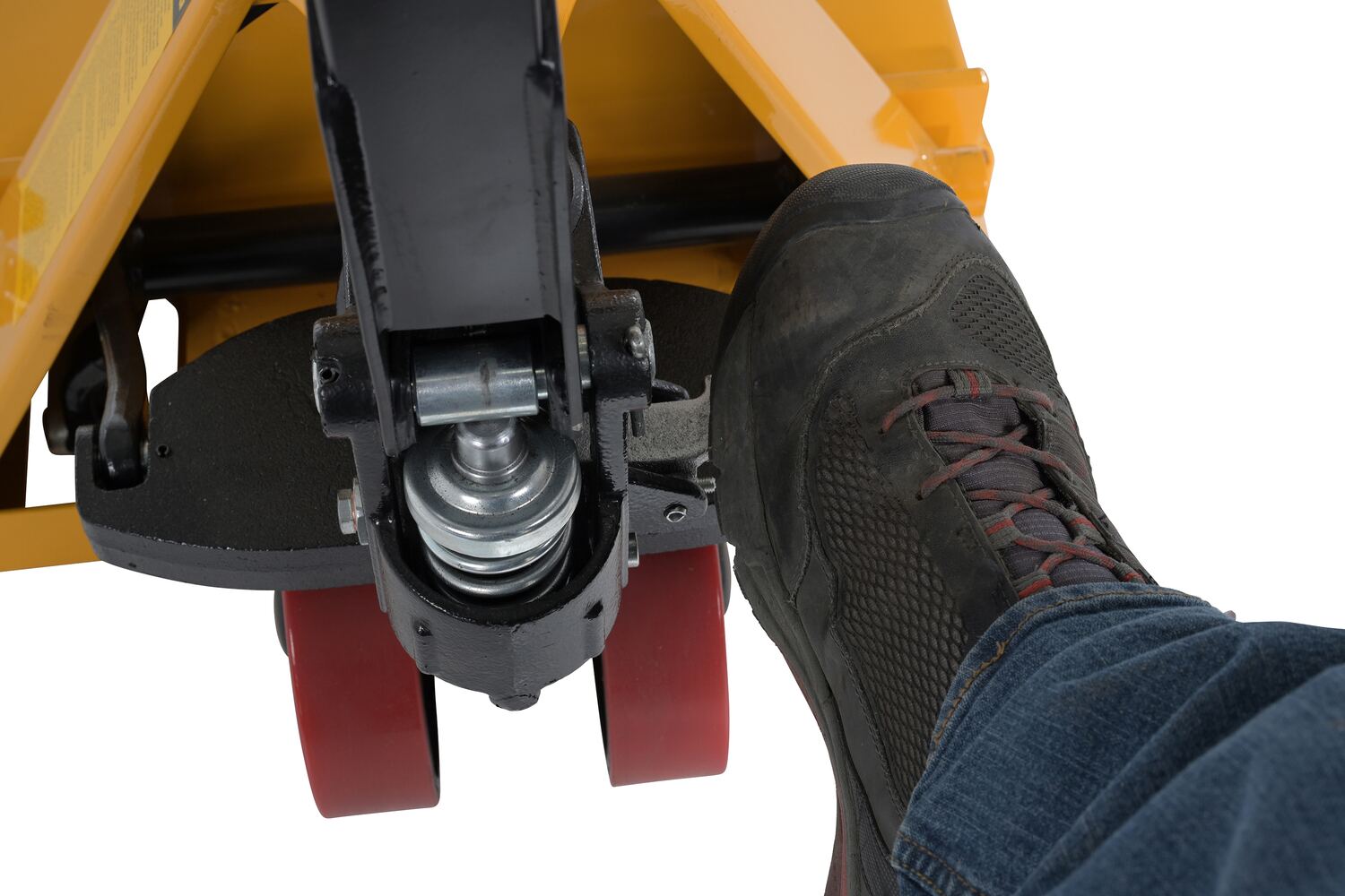 A low profile pallet truck is an economical way for one person to move heavy pallet loads without the use of a fork truck. With a scale included, items can be weighed and moved all in one unit. This brings efficiencies to warehouses and shipping areas, while bypassing the traditional time consuming weigh areas. The casters (two steer and four rollers) give the pallet truck quick movement and smooth turn-ability. The forks are built of steel and are powder coated yellow.