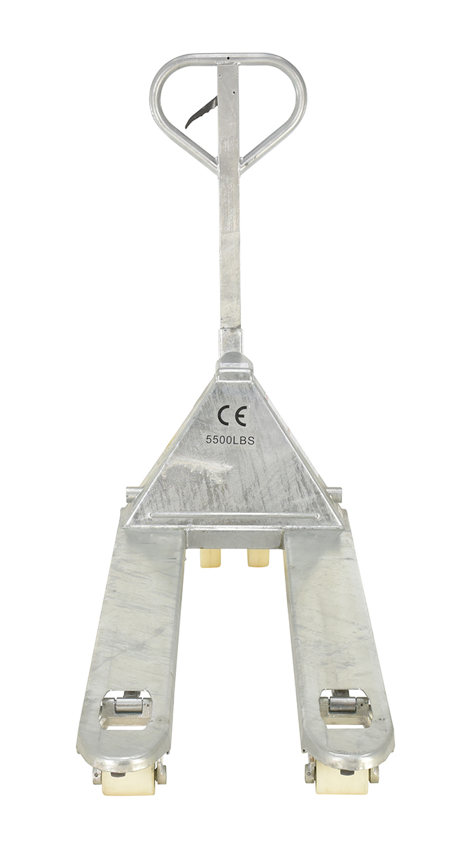 Galvanized Steel Pallet Truck 64 In. x 20-1/2 In. x 48-1/2 In. 5500 Lb. Capacity GrayThe specialized pallet trucks are ideal for corrosive environments. The pallet truck includes a galvanized finish for strong durability in the harshest of environments. Full-featured pallet trucks were designed for chemical, pharmaceutical, and wash-down applications. 5,500 pounds uniform capacity.
