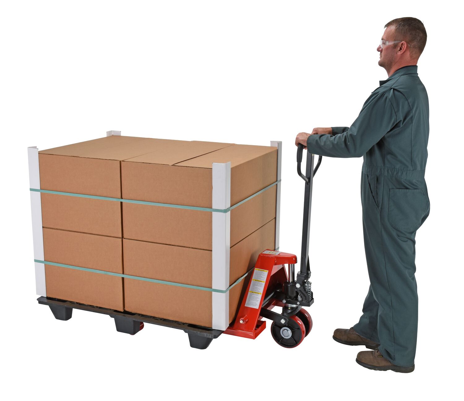 An economical way for one person to move heavy pallet loads without the use of a fork truck! Includes two articulating steering wheels and two front load rollers. Ergonomic design requires only 75 pounds of pulling force when fully loaded. Steering wheels include bearing dust covers for added life. Nose wheels are located on the front edge of each fork to assist in clean pallet entrance and exit. Reinforced triple-formed steel forks provide twice the strength of standard single-formed forks. Forks are 6." wide each. Equipped with internally mounted solid steel adjustable push rods. Spring loaded handle automatically returns to vertical position when not in use. Hydraulic pump design facilitates easy-access seal replacement. Chrome-plated hydraulic pump piston for long seal life.