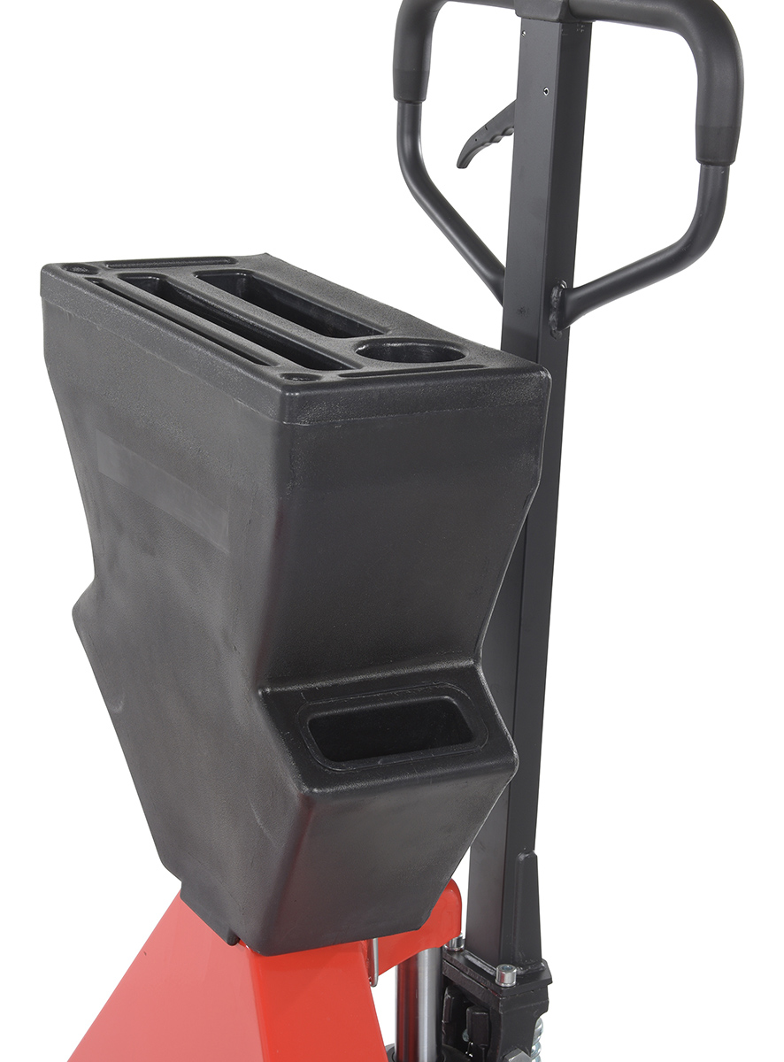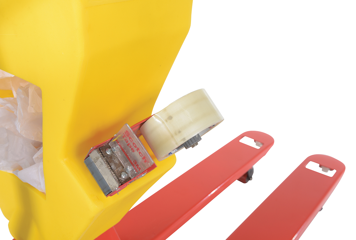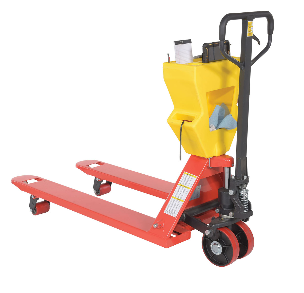 A pallet truck with a storage caddy is the perfect bundle of two innovative products. The pallet truck has an ergonomically friendly design with a limited pulling force required, while the caddy allows the user to be more organized and efficient. With a strong powder coated steel construction, the pallet truck moves easily between areas. Nose wheels are located on the front edge of each fork to assist in clean pallet entrance and exit. A molded plastic design allows the caddy to be durable throughout consistent daily use. Installation hardware and instructions included.