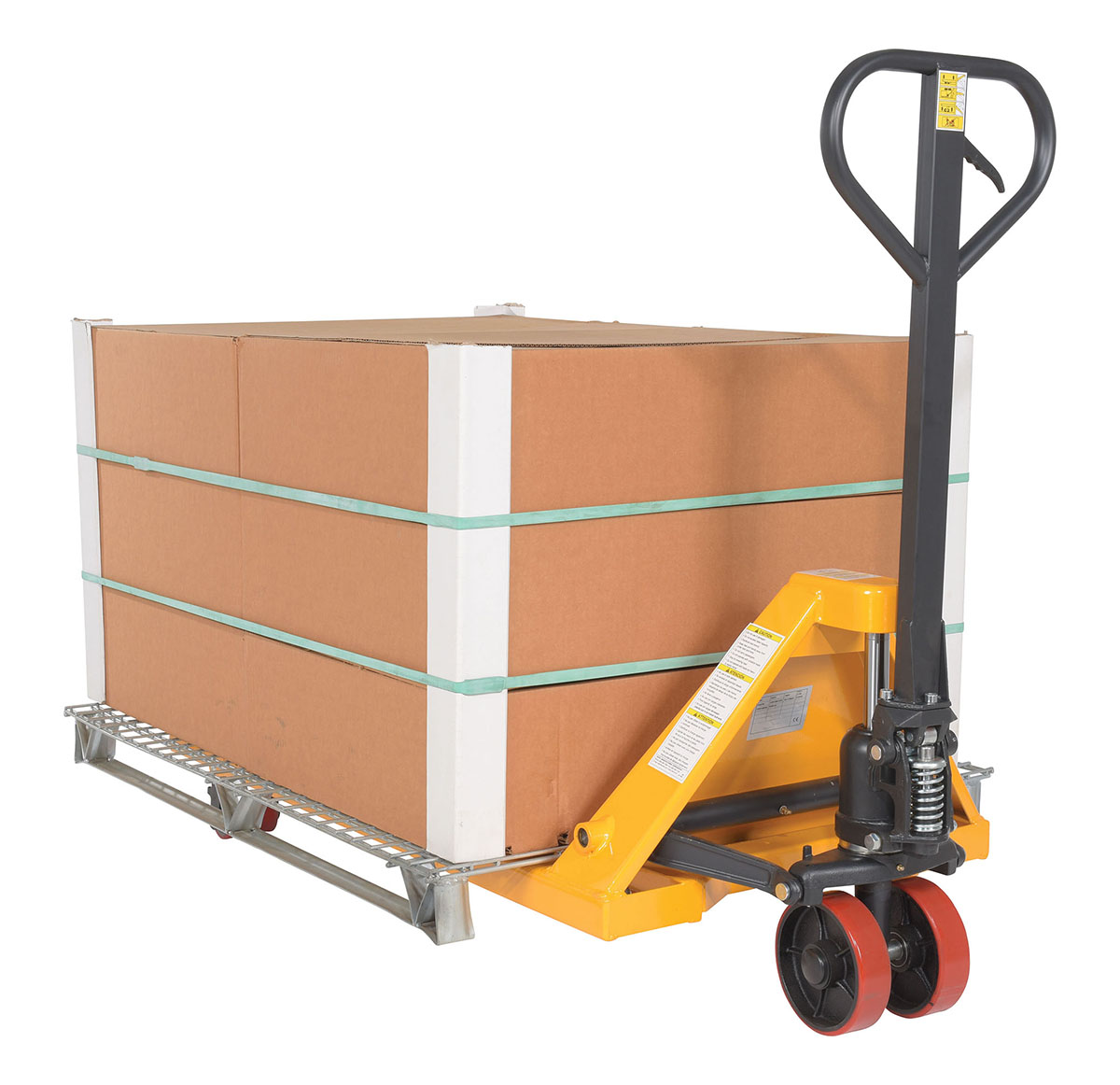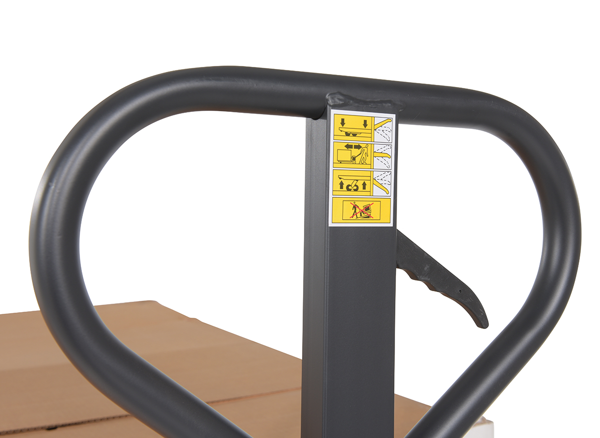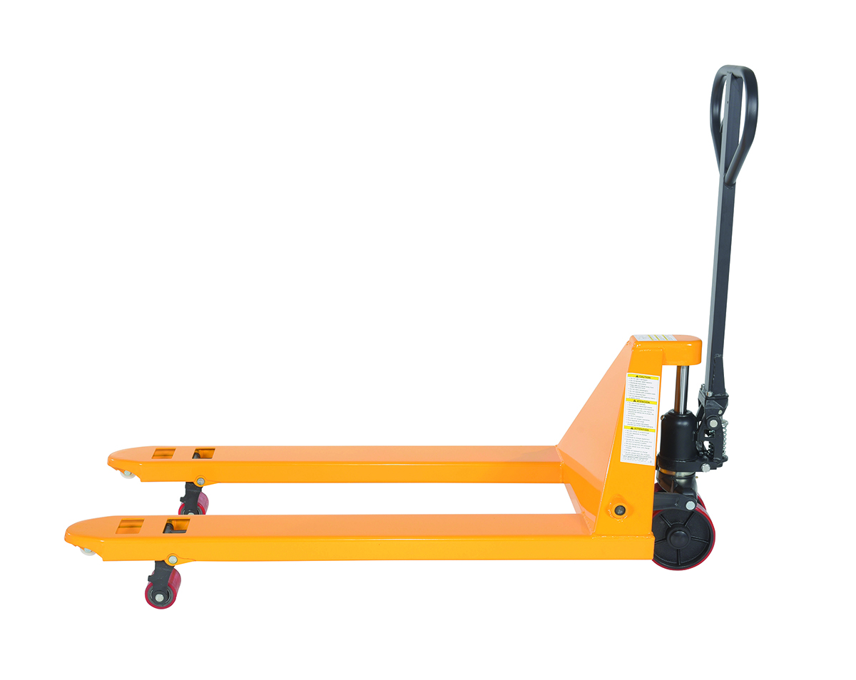 The standard pallet truck has a proven ergonomic design that has been time-tested for providing years of reliable service. It's an economical way for one person to move pallet loads without the use of a fork truck. The ergonomic design requires only seventy-five (75) pounds of pulling force when fully loaded. The spring loaded hoop handle automatically returns to vertical position when not in use. Chrome-plated hydraulic pump piston for long seal life. This pallet truck is quality built, user friendly, requires low maintenance, and has a powder coat finish.