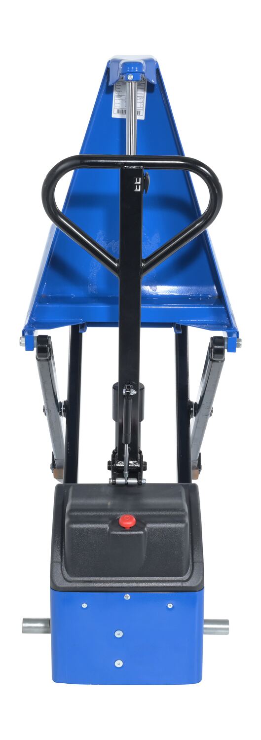 Steel Pramac DC Powered High Lift Pallet Truck 67 In. x 21-1/2 In. x 49-1/2 In. 2200 Lb. Capacity Blue/BlackThe portable high rise pallet lifter is ideal for the packaging and stocking departments. The unit is constructed of steel for strong support and durability during day to day use. The green color lends itself to clear visibility from across crowded workplaces. A push button can be utilized to cut off functionality of the pallet lifter in the case of an emergency. To use, simply slide forks of the unit through the pallet openings and lift to desired height.