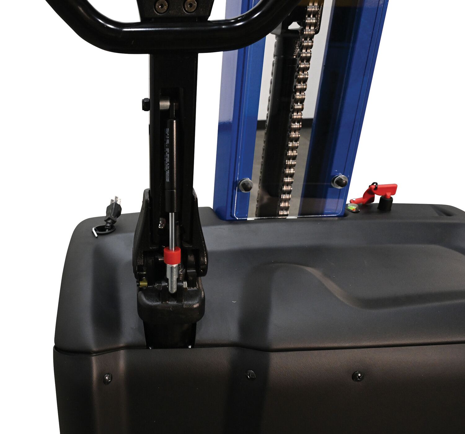 Steel Pramac DC Powered Narrow Mast Stacker Fixed Forks 67 In. x 31 In. x 73-1/2 In. 2200 Lb. Capacity Blue / BlackElectric power drive and lift. Ergonomic handle with a full control and safety system. Features "tortoise" push button for slow motion, a safety punch button with warning buzzer, and on-board battery charger. DC powered with two (2) 12V batteries.