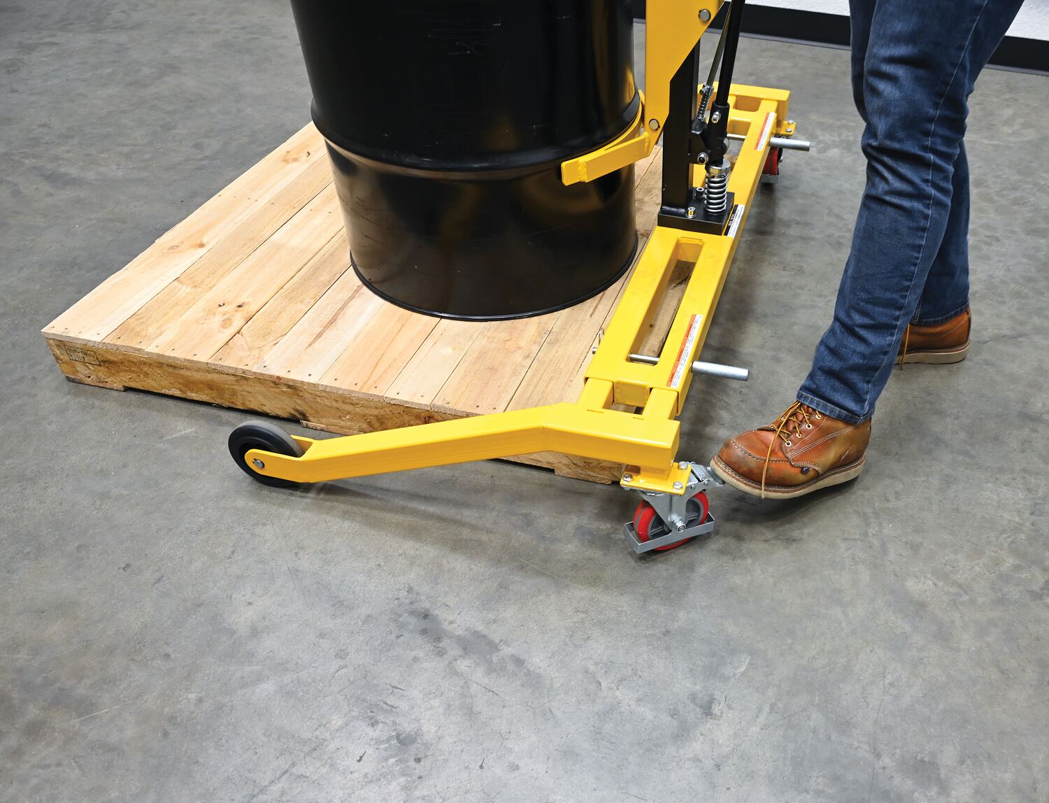 Steel Pallet Straddling Drum Truck 46 In. Long x 32 In. Wide x 47 In. Height 550 Lb. Capacity YellowA single operator can engage, lift and transport drums stored either on the center of pallets or the corner of containment skids with this pallet straddling drum truck. Works with steel drums. To engage a drum, the truck uses a rim clamp that securely grasps the top lip of the drum. Wheels provide a high degree of maneuverability; each swivel wheel is protected by guards and is equipped with brakes.