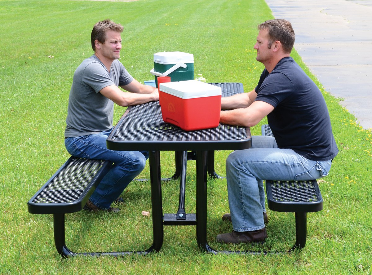 Steel Picnic Table Expanded Metal Rectangle Top 30 In. x 96 In. BlackBuilt to last and highly attractive, this commercial grade metal picnic table is constructed of expanded metal that features a diamond pattern. Finished to endure the elements with virtually no maintenance. Tops and seats are coated with a rugged thermoplastic layer that's attractive and durable. Galvanized tubular steel legs and supports are protected with a black powder coat finish designed for strength and stability.