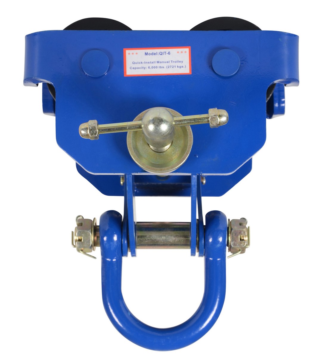 Steel Quick Install Manual Trolley 11 In. x 16-7/8 In. x 14-9/16 In. 6000 Lb. Capacity BlueThis quick install manual trolley is dependable, easy and safe to use. Designed to easily adjust to the width of virtually any S, H, W and M type I-beam. Width is adjusted with manual screw mechanism. Includes locking ring to prevent trolley width from changing accidentally. Manual screw mechanism may also be tightened to prevent trolley from moving (similar to a beam clamp). Each trolley includes four (4) rollers with sealed bearings for long life. A lifting eye is located at the bottom of the trolley for attaching a hoist (not included).