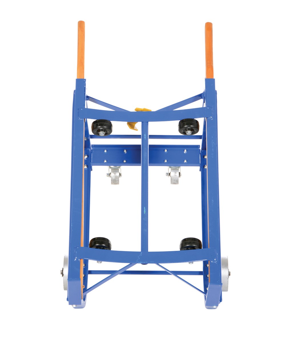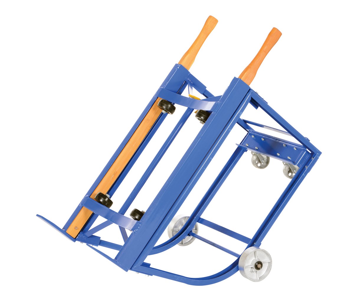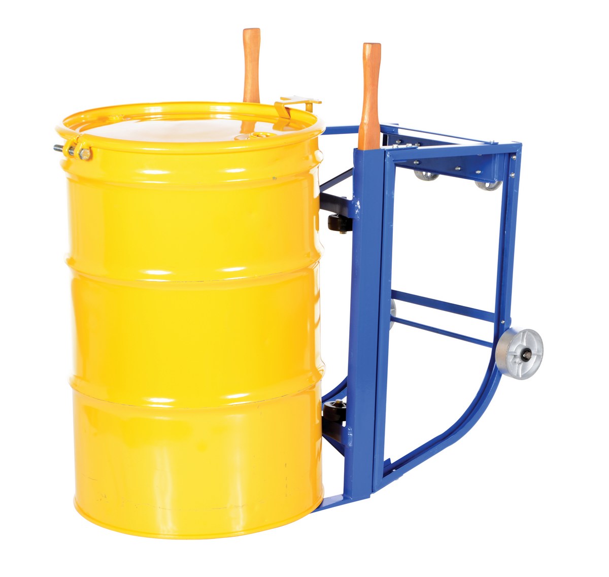 Steel Rotating Drum Cart with Steel Wheels 42 In. x 19 In. x 27-1/2 In. 1000 Lb. Capacity BlueThis practical design makes it easy to operate the deluxe rotating drum cart. Two (2) retractable wooden handles included for easy operation. Steel stops enable operator to hold drum during tipping operation and includes a built-in bung nut wrench as a bonus.