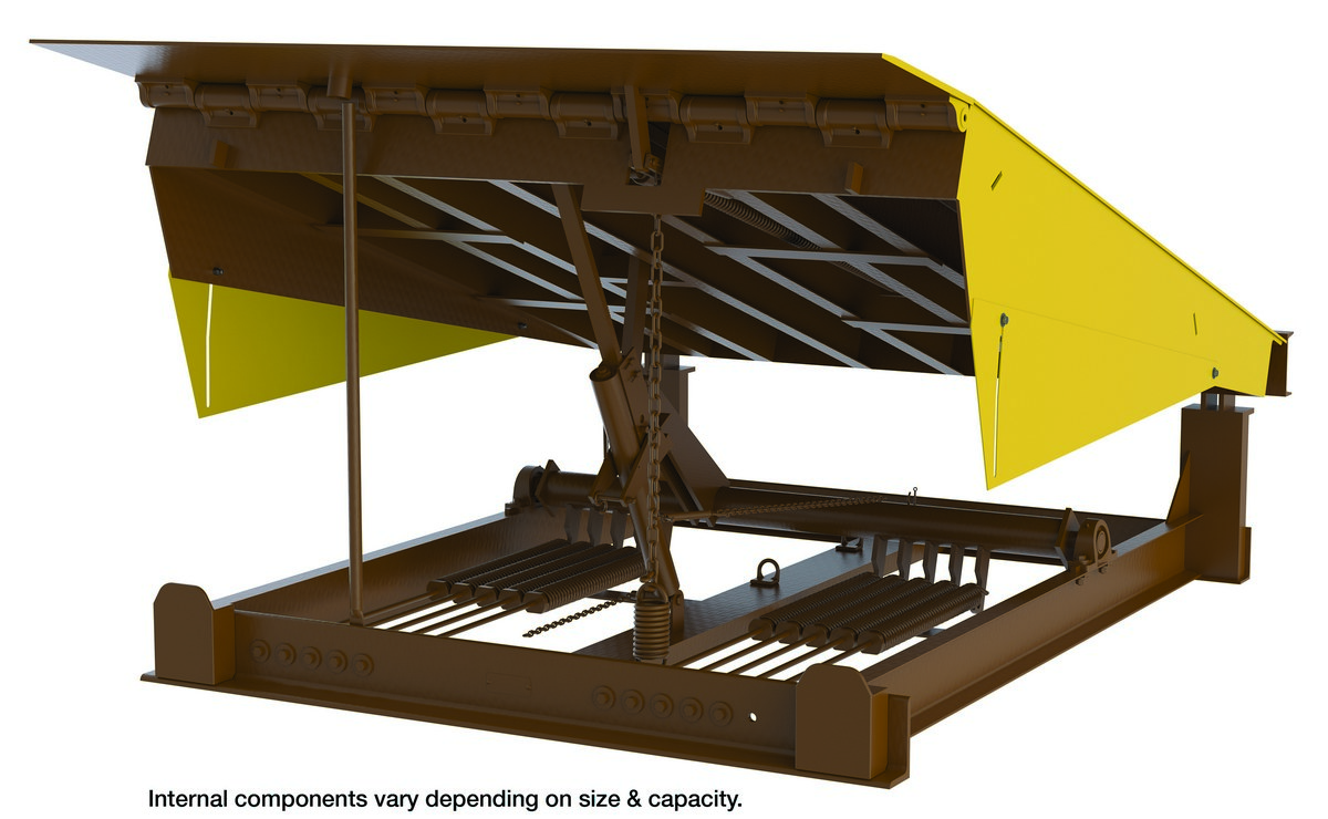 Steel Pull Chain Mechanical Dock Leveler 86"W x 86"L x 24"D Pit Dimensions 25000 Lb. Capacity Brown/YellowThe mechanical dock leveler is constructed of heavy duty checkered plate deck steel for long term support of the steel channel understructure. The dock leveler allows for easy truck loading and unloading. The leveler is engineered and designed for minimum maintenance and features a smooth pull chain operation.