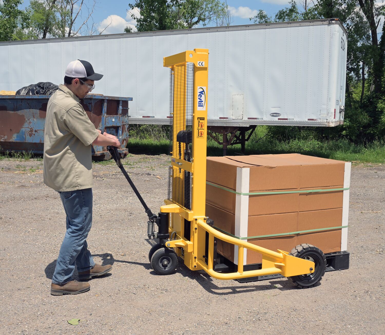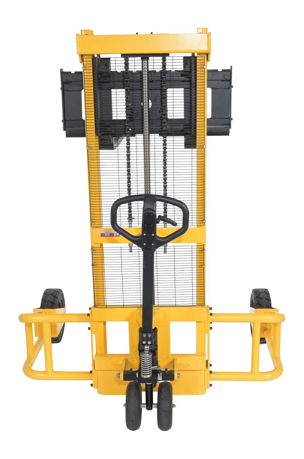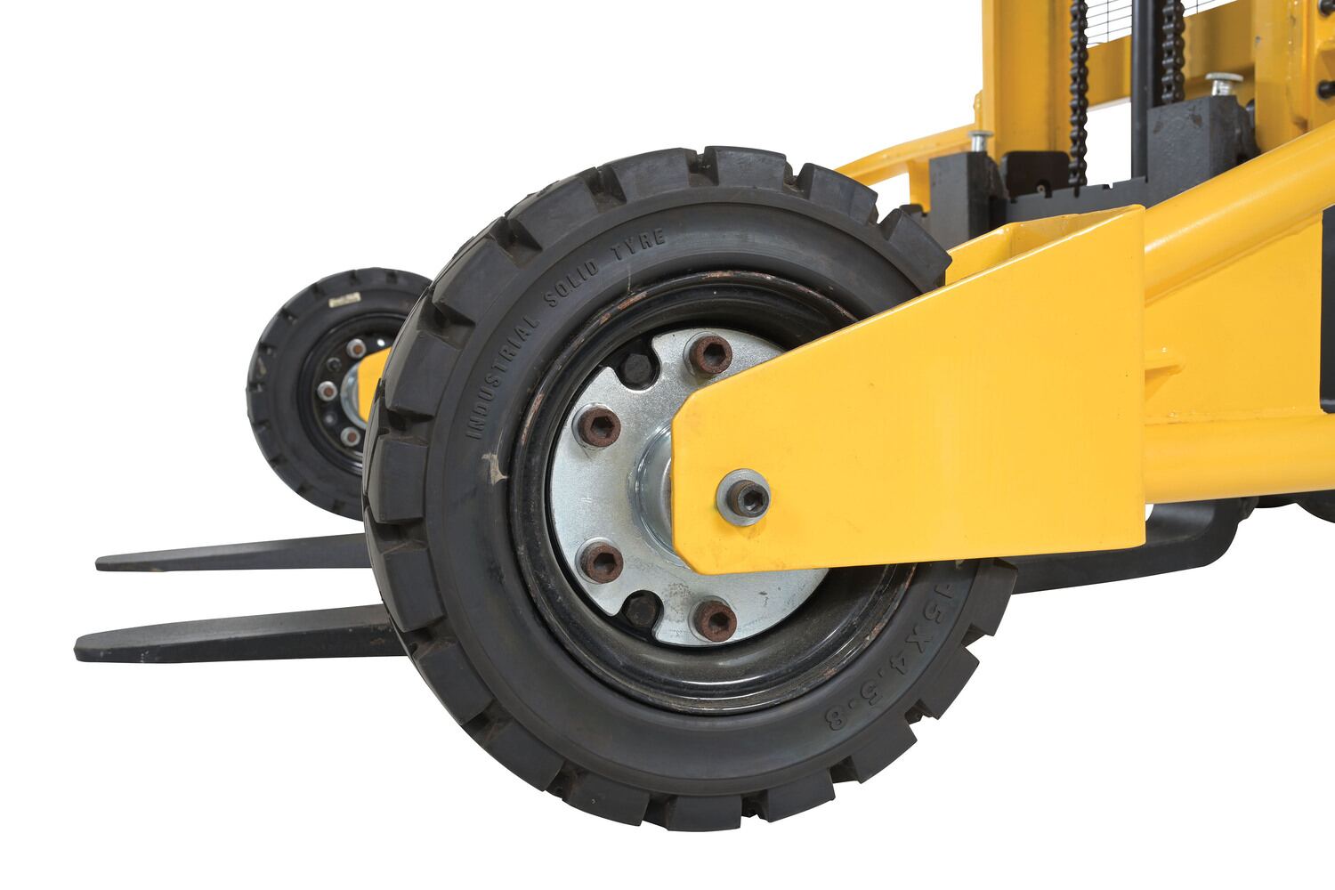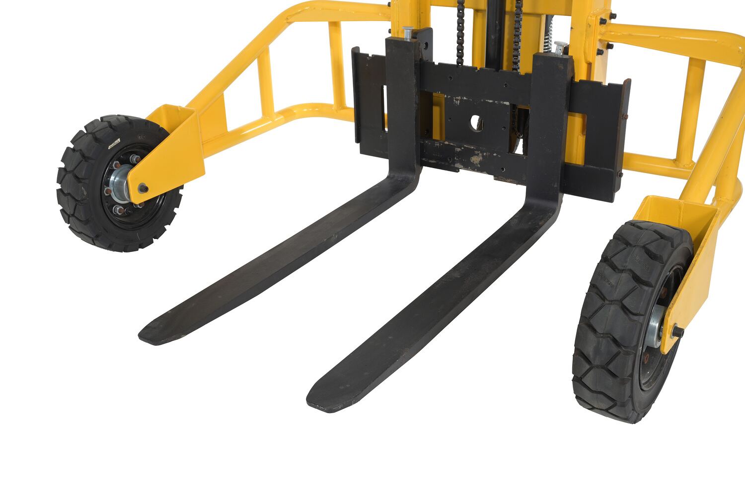 Steel Manual Rough Terrain Stacker 62 In. Raised Height 2,000 Lb. Capacity YellowA rough terrain stacker is capable of going where other stackers can't. The manual design benefits the user by giving precise movement of the unit in particular areas. A simple handle pump lifts and lowers, without the need for mechanical power. Just a simple hydraulic action leads the forks up or down to the desired height. The rubber tires provide stability when traversing rough or uneven surfaces. Baked in yellow powder coat finish.