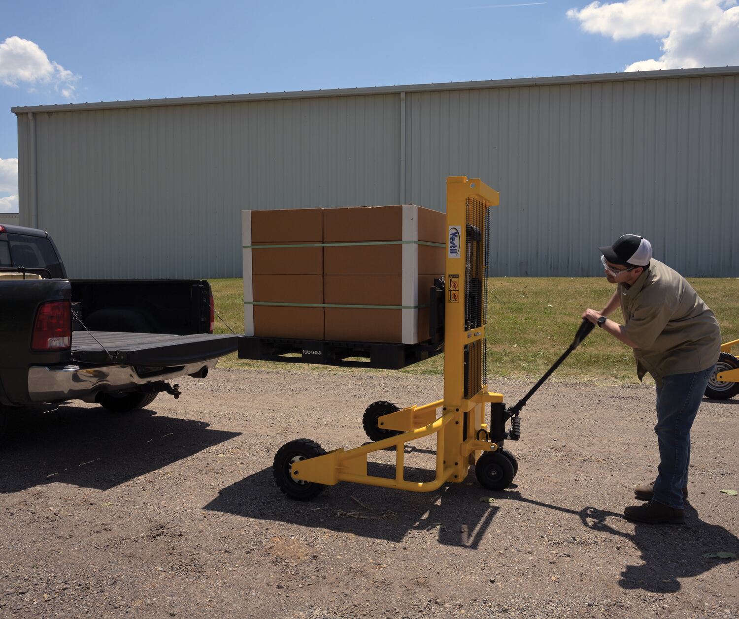 A rough terrain stacker is capable of going where other stackers can't. The manual design benefits the user by giving precise movement of the unit in particular areas. A simple handle pump lifts and lowers, without the need for mechanical power. Just a simple hydraulic action leads the forks up or down to the desired height. The rubber tires provide stability when traversing rough or uneven surfaces. Baked in yellow powder coat finish.
