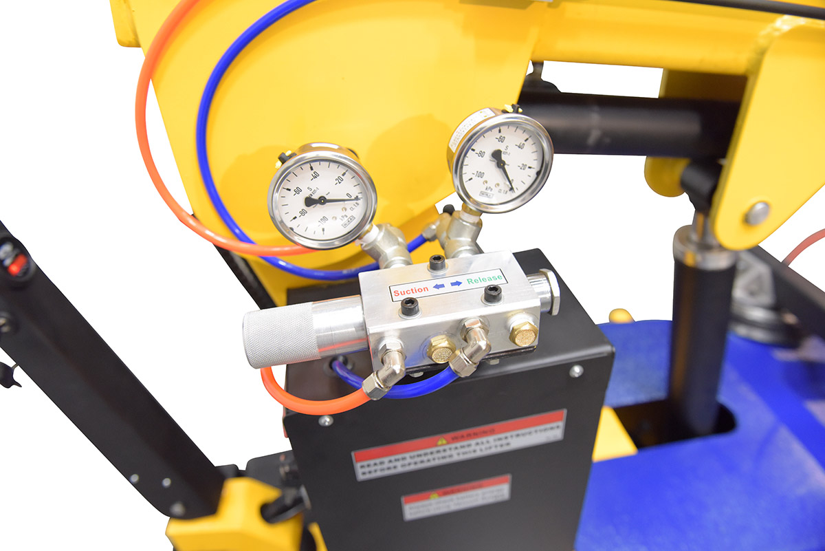 Steel Rough Terrain Vacuum Move Lifter with 6 Suction Cups 1200 Lb. Capacity Black / YellowA vacuum material lift is a great way to safely transfer large items. With the six suction cups widely spaced the lifter can be positioned in a variety of ways to best be utilized. An ergonomic walk behind steering handle allows the user to have quick maneuverability. Vacuum controls are placed at the rear of the unit to give the user complete visibility of the unit and of the item being positioned. Vacuum lifting arm is telescoping and adjustable to fit a wide range of areas. Rubber wheels are perfect for minimizing jostling while traversing a variety of surfaces. Powder coated steel construction for built in added toughness.