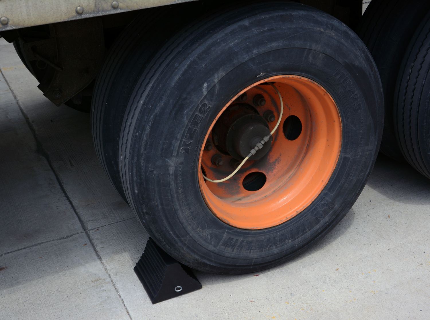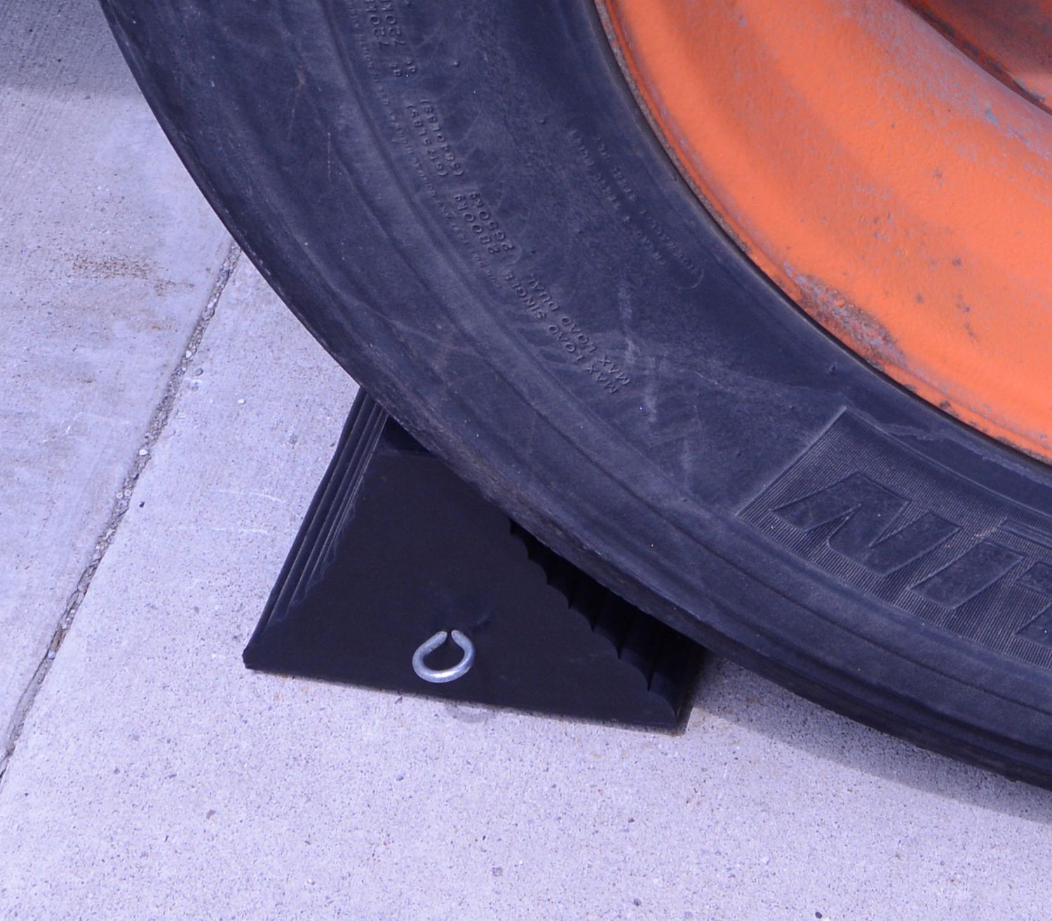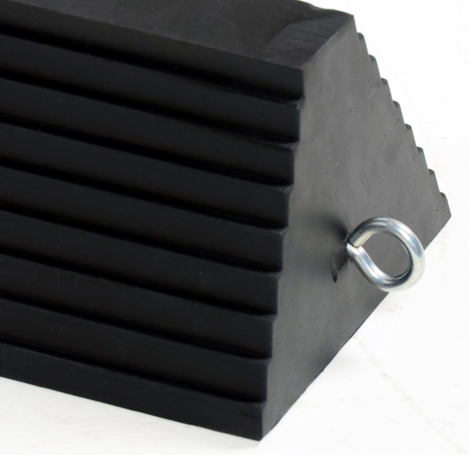The rubber Wheel Chock with eye bolt is constructed of reinforced rubber to provide a sure grip on virtually any surface. The curved surface contours to fit tires. Rubber resists tearing, abrasion, ozone weathering, etc. The functional design is durable in all weather conditions. This particular model is constructed of a mix of virgin and recycle, no reinforcement cords.