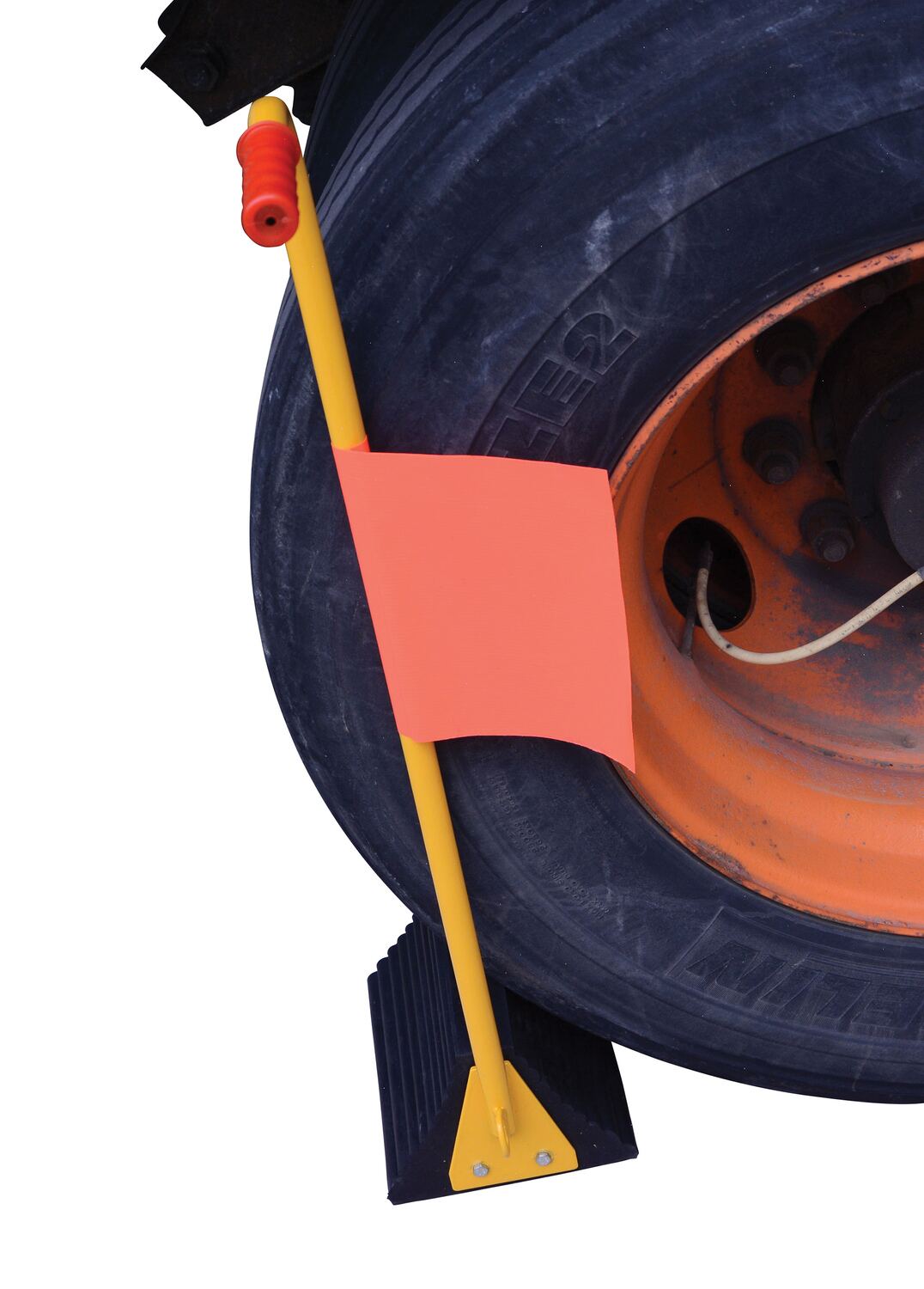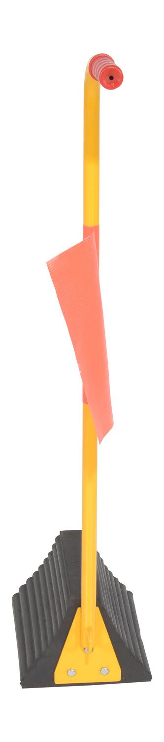 Rubber Wheel Chock With Handle and Flag 12 In.The ergo-handle Wheel Chock has an ergonomic design that makes it easy to move wheel chocks in and out of position under trailer wheels. It reduces the risk of back, knee, and foot injuries. The handle is constructed of steel and has a yellow powder coat finish. Hardware included. Assembly required. D-ring provided for attaching security chain. A vinyl flag is included to provide added visibility and awareness to the chock. Chain not included.