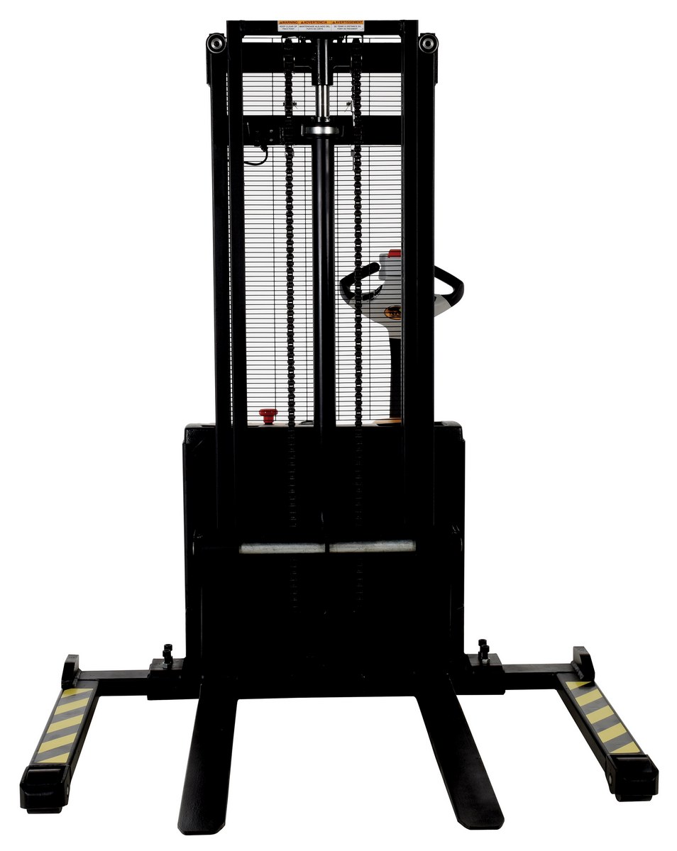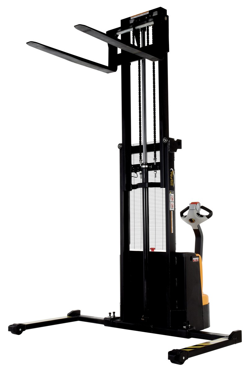 Steel Adjustable Double Mast Stacker 101 In. Raised Height 2200 Lb. Capacity Black / YellowDouble mast fully powered electric stacker transports loads throughout warehouse facilities quickly and with less effort. High torque drive and lift motor handles heavy-duty jobs. Ergonomic handle features easy-to-operate throttle with infinite adjustment of forward and reverse speeds, lift/lower controls, proprietary safety-enhancing emergency reverse function, and horn. Includes an electromagnetic disc brake with automatic dead-man feature that activates when user releases the handle. Powered lifter has two lead acid deep cycle batteries, A battery charger, gauge and horn are included . stacker rolls smoothly on poly-on-steel steer and load wheels. 3-4 hour operation at full charge - 8 hours when used intermittently.