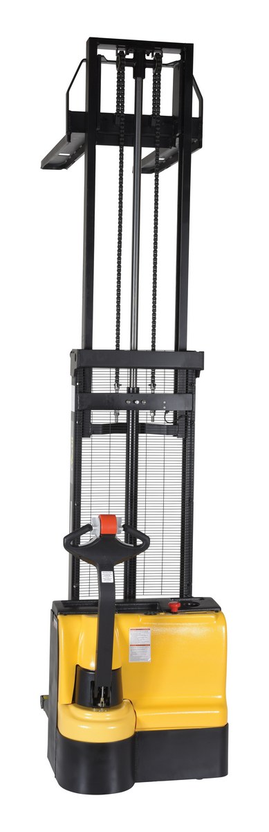 Steel Fixed Forks Double Mast Stacker 118 In. Raised Height 2200 Lb. Capacity Black / YellowDouble mast fully powered electric stacker transports loads throughout warehouse facilities quickly and with less effort. High torque drive and lift motor handles heavy-duty jobs. Ergonomic handle features easy-to-operate throttle with infinite adjustment of forward and reverse speeds, lift/lower controls, proprietary safety-enhancing emergency reverse function, and horn. Includes an electromagnetic disc brake with automatic dead-man feature that activates when user releases the handle. Powered lifter has two lead acid deep cycle batteries. .A battery charger, gauge and horn are included. Stacker rolls smoothly on poly-on-steel steer and load wheels. 3-4 hour operation at full charge - 8 hours when used intermittently.