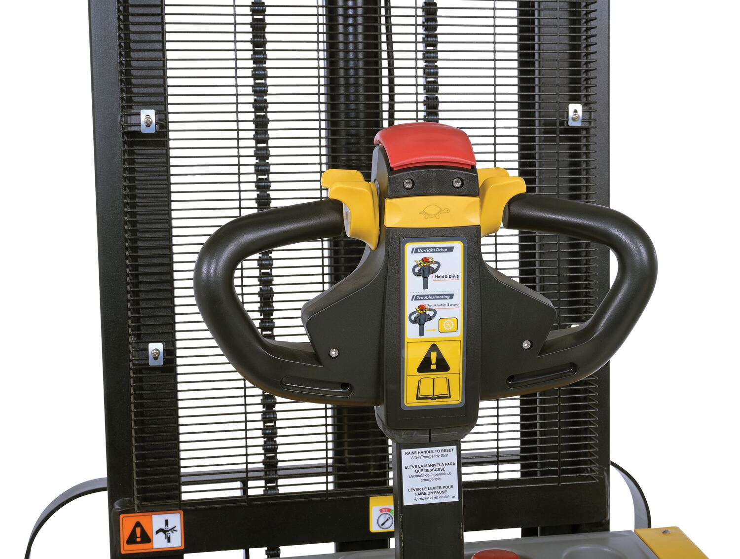 Steel Adjustable Double Mast Stacker 118 In. Raised Height Variable Speed 2200 Lb. Capacity BlackThe double mast fully powered electric stacker transports loads throughout warehouse facilities quickly and with less effort. High torque drive and lift motor handles heavy duty jobs. Ergonomic handle features lift/lower controls, proprietary safety enhancing emergency reverse function, and horn. The unit includes an electromagnetic disc brake with automatic dead-man feature. Powered lifter has two 12V lead acid deep cycle batteries, integral battery charger, and a battery level gauge.