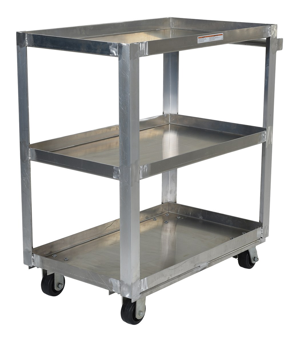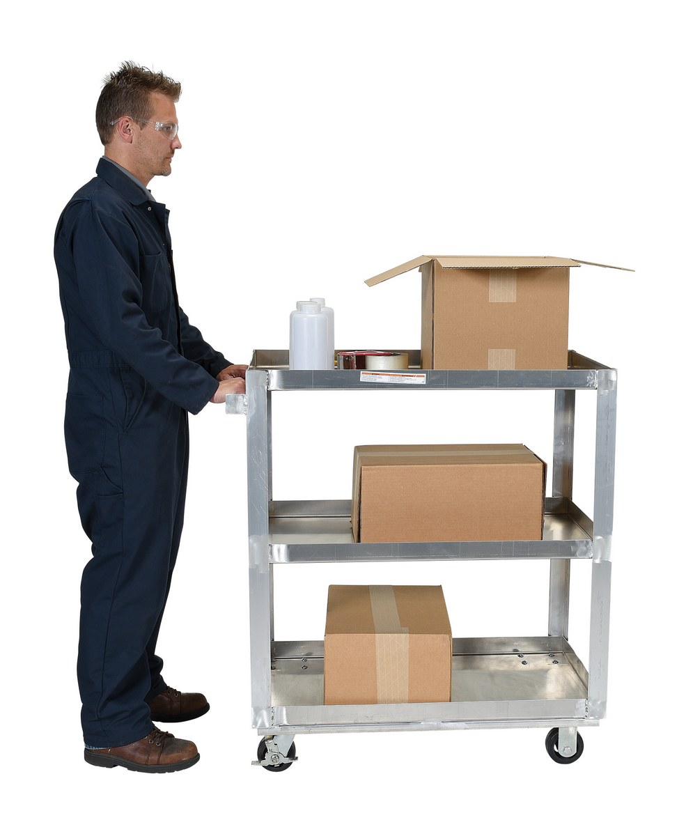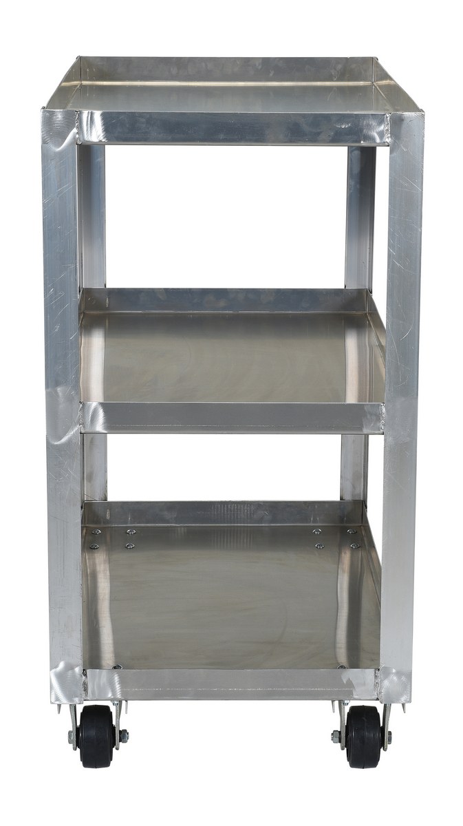 Aluminum Service Cart 3 Shelves 38-5/16 In. x 21-15/16 In. x 41-3/4 In. 660 Lb. Capacity SilverAll welded service cart, made of aluminum is ideal for transporting parts and boxes. This unit has three (3) shelves, a lip is turned up on all shelves to prevent items from sliding off.