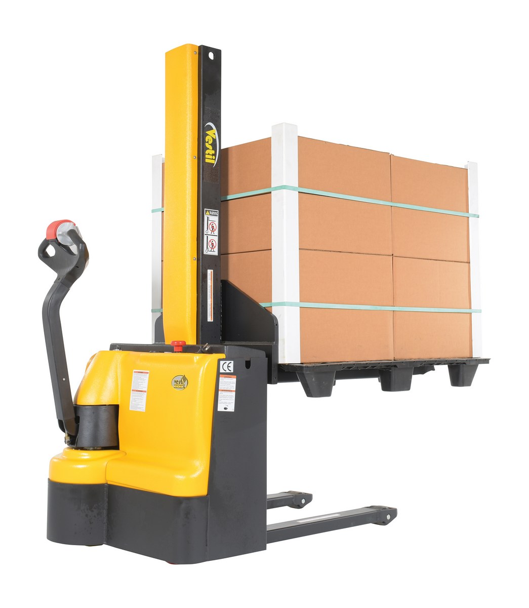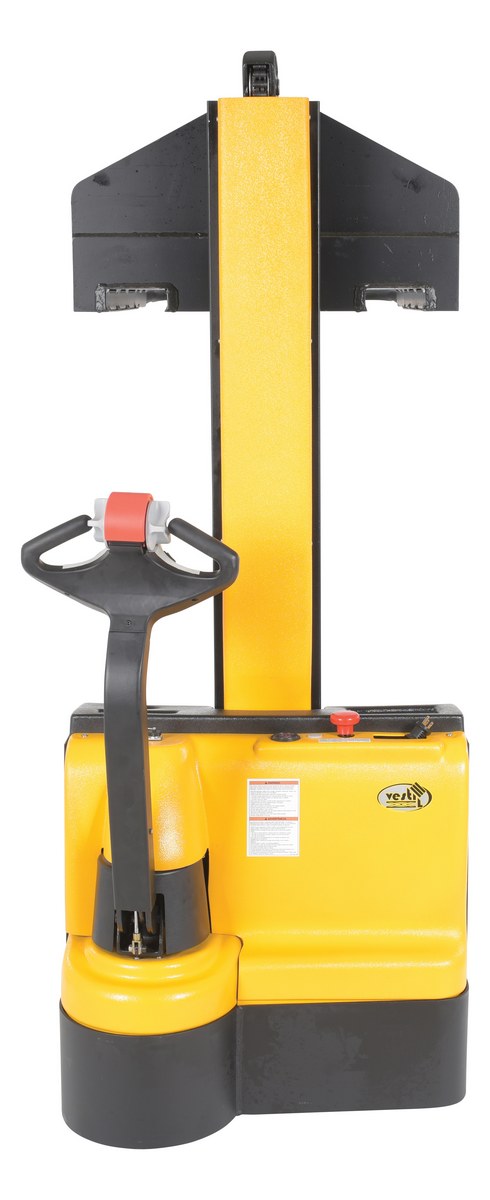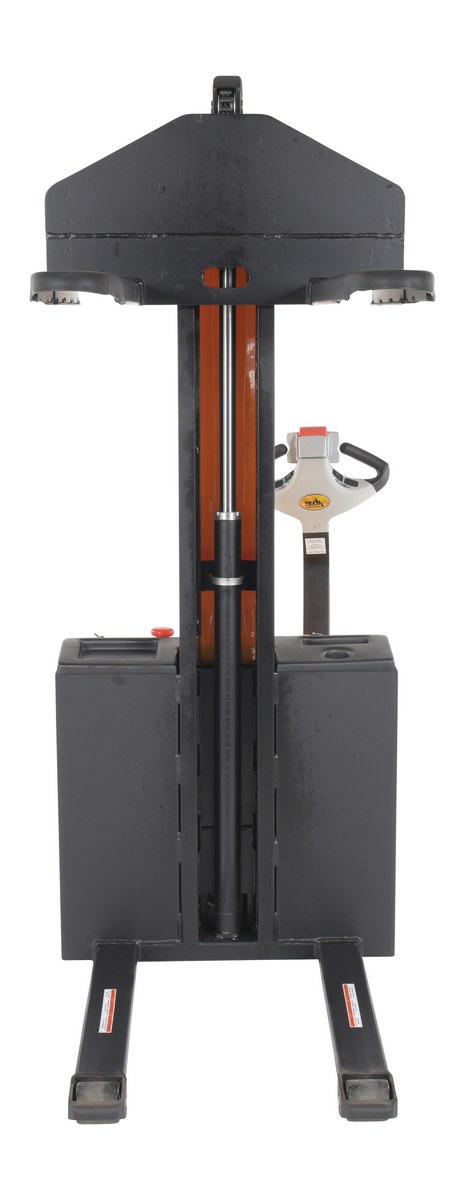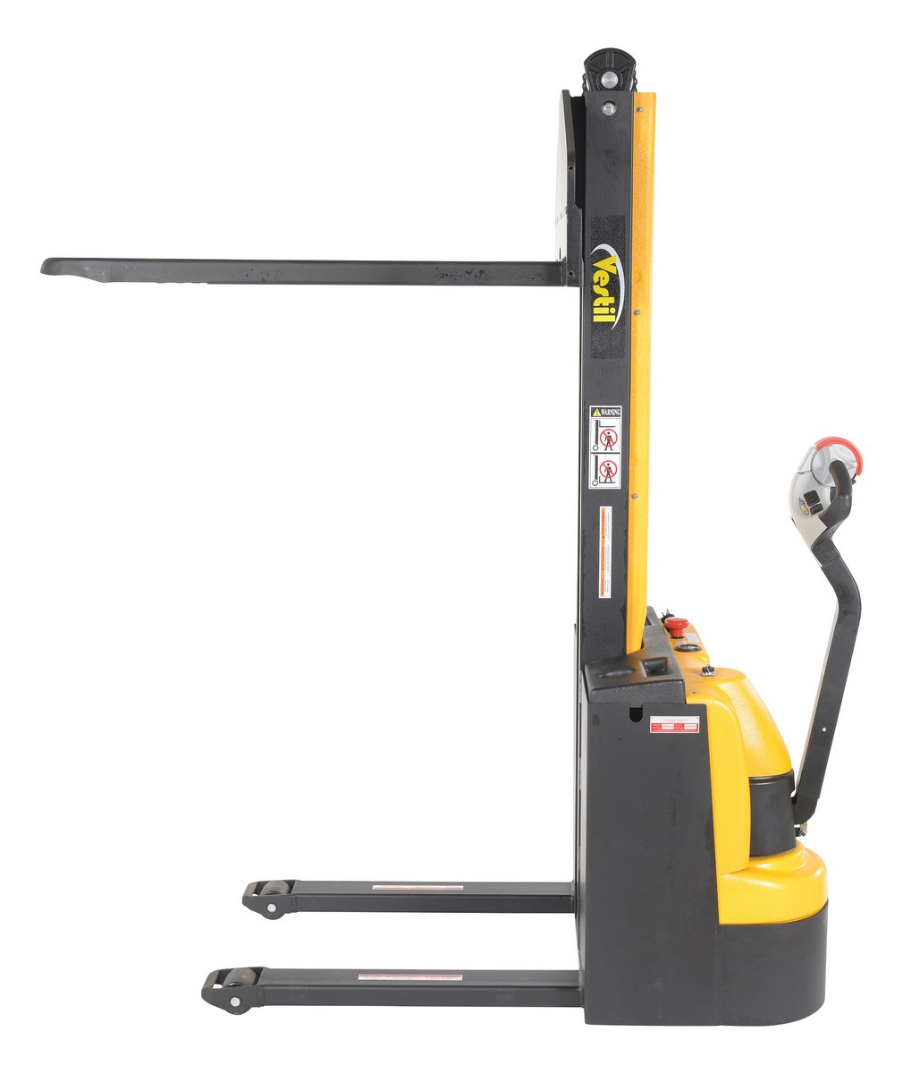 Steel Narrow Mast Stacker DC Powered 62 In. Raised Height Fixed Fork 27 In. Fork Width 2,200 Lb. Capacity Black / YellowThe narrow mast stacker is great for the shipping and manufacturing facilities. The stacker provides a fast efficient solution to loading and unloading products in closely confined areas. The stacker features a simple throttle design for lifting control, as well as, infinite forward and reverse speed adjustments. The unit drives on poly on steel steering and load wheels, which provide excellent maneuverability. A battery charger, gauge and horn are included. Models are available with fixed or adjustable forks as well as fixed or adjustable leg supports.