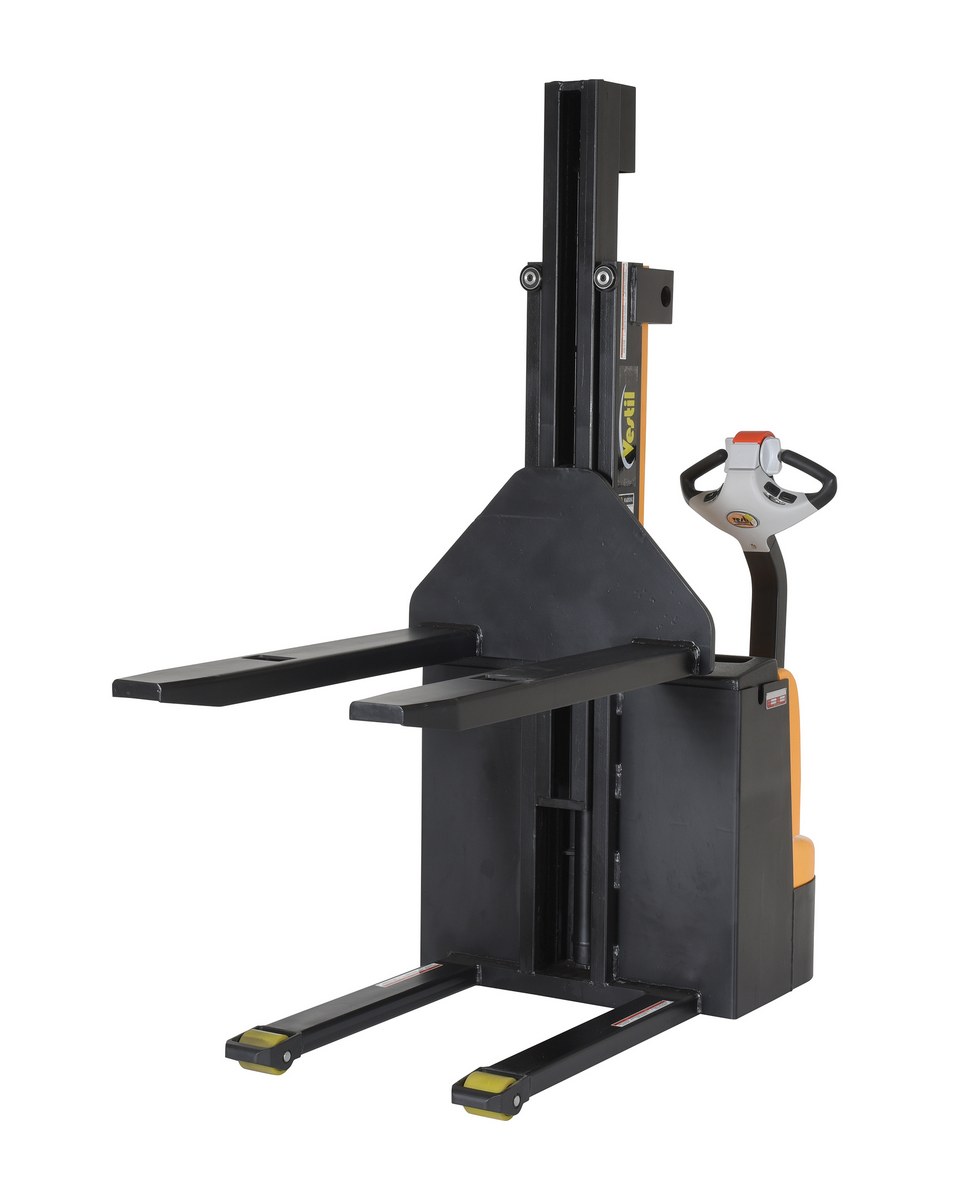 Steel Narrow Mast Stacker DC Powered 90 In. Raised Height Fixed Fork 27 In. Fork Width 2,500 Lb. Capacity Black / YellowThe narrow mast stacker is great for the shipping and manufacturing facilities. The stacker provides a fast efficient solution to loading and unloading products in closely confined areas. The stacker features a simple throttle design for lifting control, as well as, infinite forward and reverse speed adjustments. The unit drives on poly on steel steering and load wheels, which provide excellent maneuverability. A battery charger, gauge and horn are included. Models are available with fixed or adjustable forks as well as fixed or adjustable leg supports.