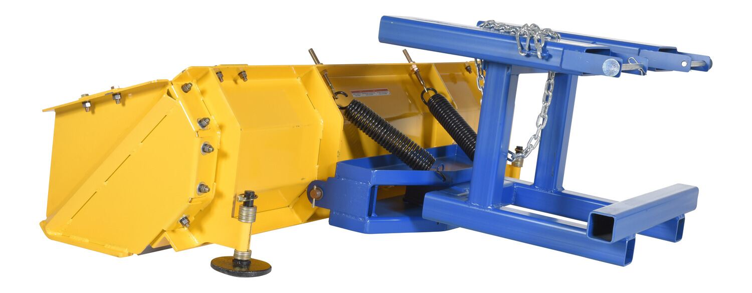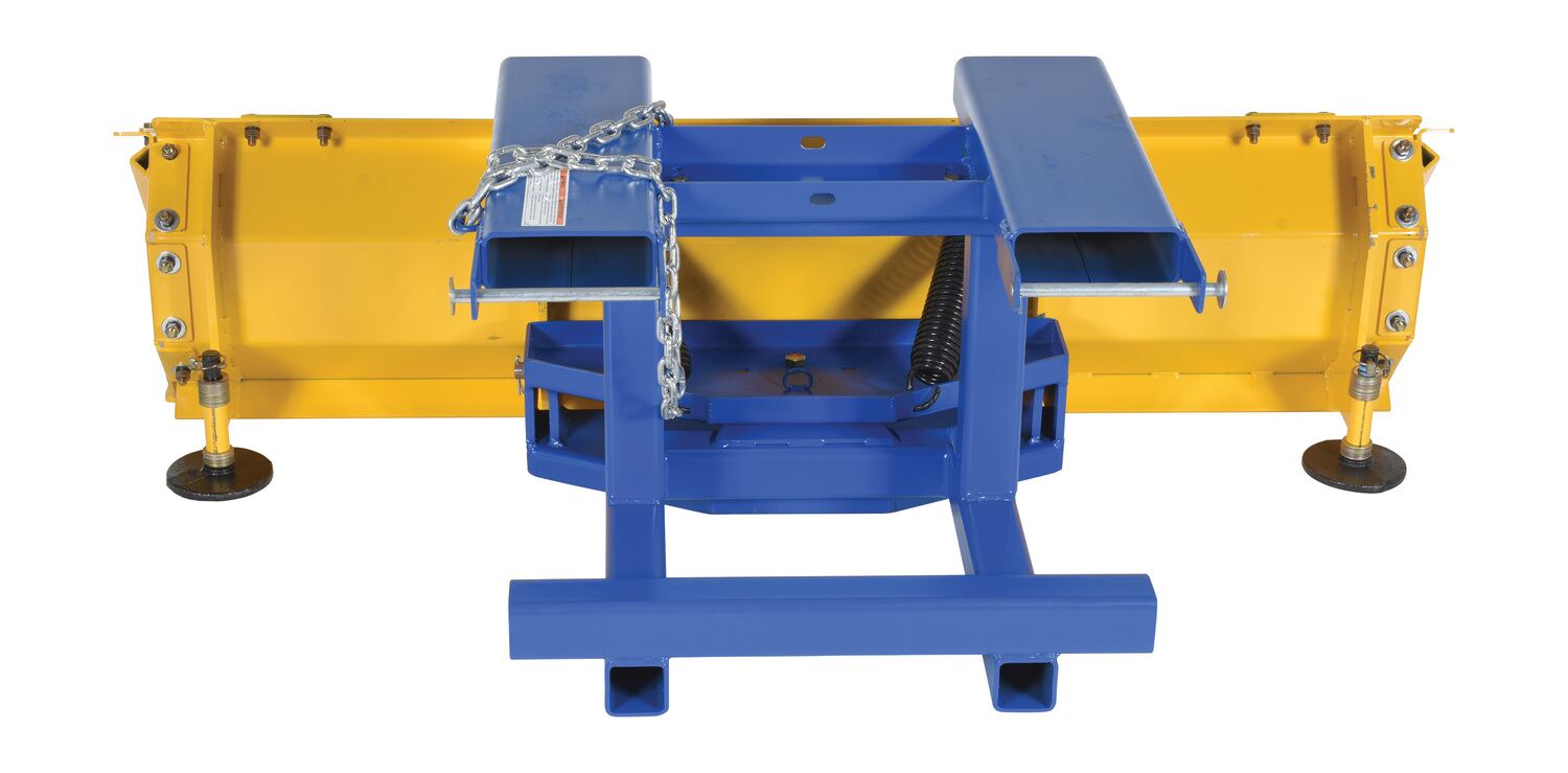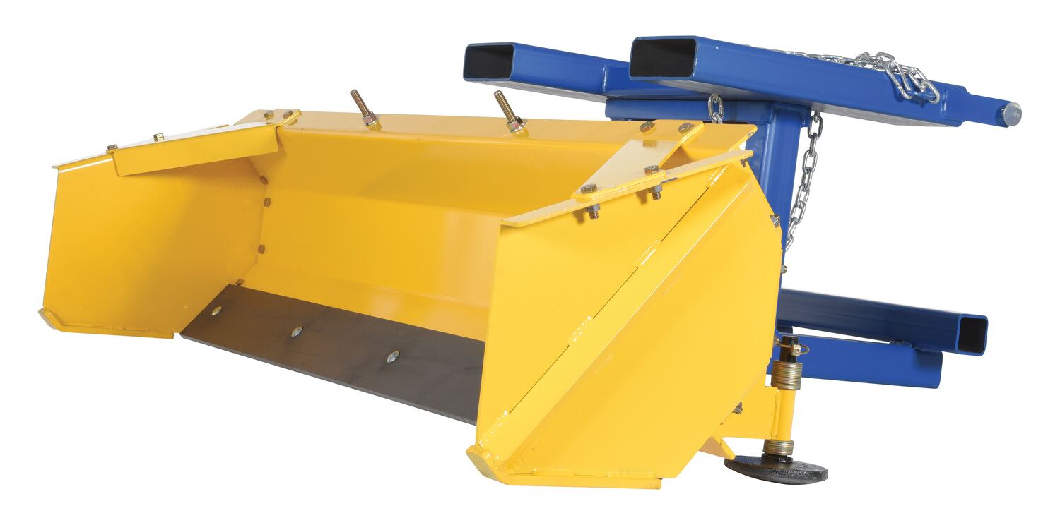 Unique design attaches to fork truck forks. Pass through fork tubes keep weight back towards fork truck mast. Locking pins secure snow plow to forks for safety. The steel construction has a brightly colored baked-in powder-coated finish for added toughness and clear visibility. The attached sides contain the snow in a direct manner for time and safety efficiency.