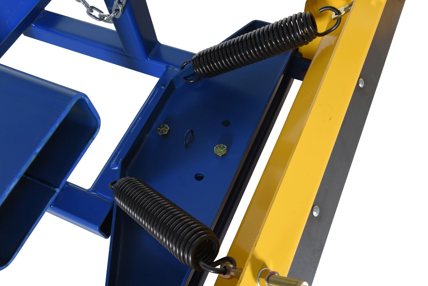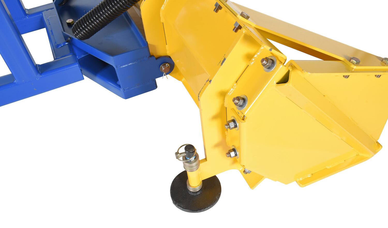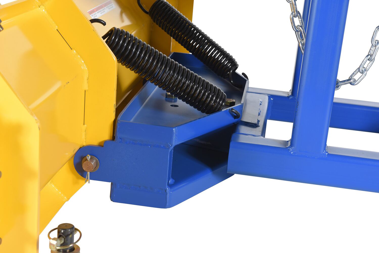 Unique design attaches to fork truck forks. Pass through fork tubes keep weight back towards fork truck mast. Locking pins secure snow plow to forks for safety. The steel construction has a brightly colored baked-in powder-coated finish for added toughness and clear visibility. The attached sides contain the snow in a direct manner for time and safety efficiency.