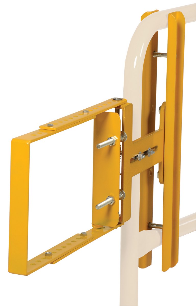 Customize your safety railings with a self-closing steel gate. The gate can be mounted from the left or right with the included mounting hardware. Mount to horizontal rails. Yellow powder coat finish. (Railing and base not included).