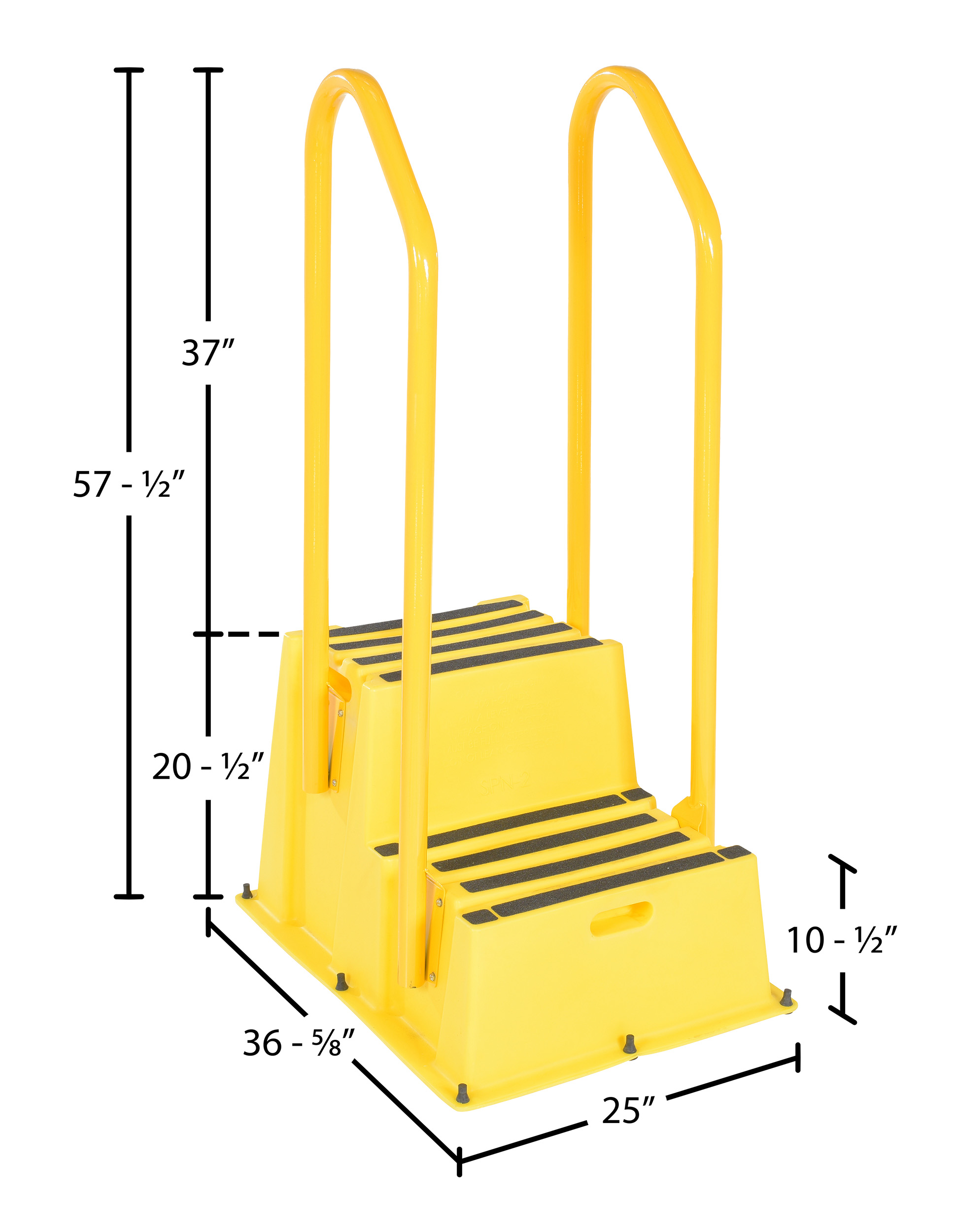 Polyethylene Nestable with Handrails Casters 2 Step 500 Lb. Capacity YellowA poly step stool is a great asset for on the go or in a permanent setting. A lightweight design with front and side cutout handles, allow the user to easily transfer the stool to a preferred spot. The taped step surfaces ensure safe footing while traversing up and down the steps. Includes bolt on handrail and casters. The hand rails height allows the unit to be pushed or pulled into the desired position, minimizing bending and twisting by the user. Steps can be nested to minimize footprint when not in use.