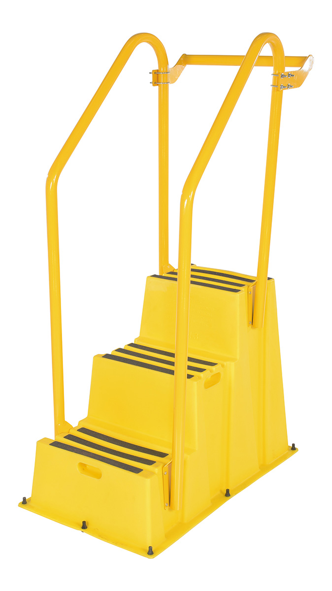 Polyethylene Nestable with Hand and Back Rails Casters 3 Step 500 Lb. Capacity YellowA poly step stool is a great asset for on the go or in a permanent setting. A lightweight design with front and side cutout handles, allow the user to easily transfer the stool to a preferred spot. The taped step surfaces ensure safe footing while traversing up and down the steps. Includes bolt on back rail, handrail, and casters. The hand rails height allows the unit to be pushed or pulled into the desired position, minimizing bending and twisting by the user. Steps can be nested to minimize footprint when not in use.