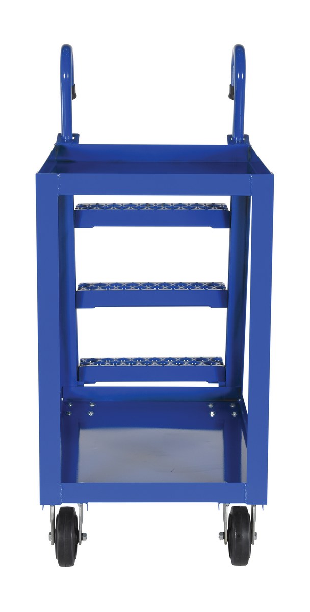 Steel Stock Picker 2 Shelf with Rubber On Steel Casters 39-3/4 In. x 21-7/8 In. x 50-1/8 In. 1,000 Lb. Capacity BlueCombine the mobility of a cart with the versatility of a step ladder with this stock picker truck. Convenient spring loaded steel step ladder holds the cart securely in place while a person is standing on the ladder. Crutch tip ladder prevents the cart from moving while stocking. Springs then return the ladder to the raised position once personnel exit the step. All shelves have the lip turned up to prevent items from falling off.