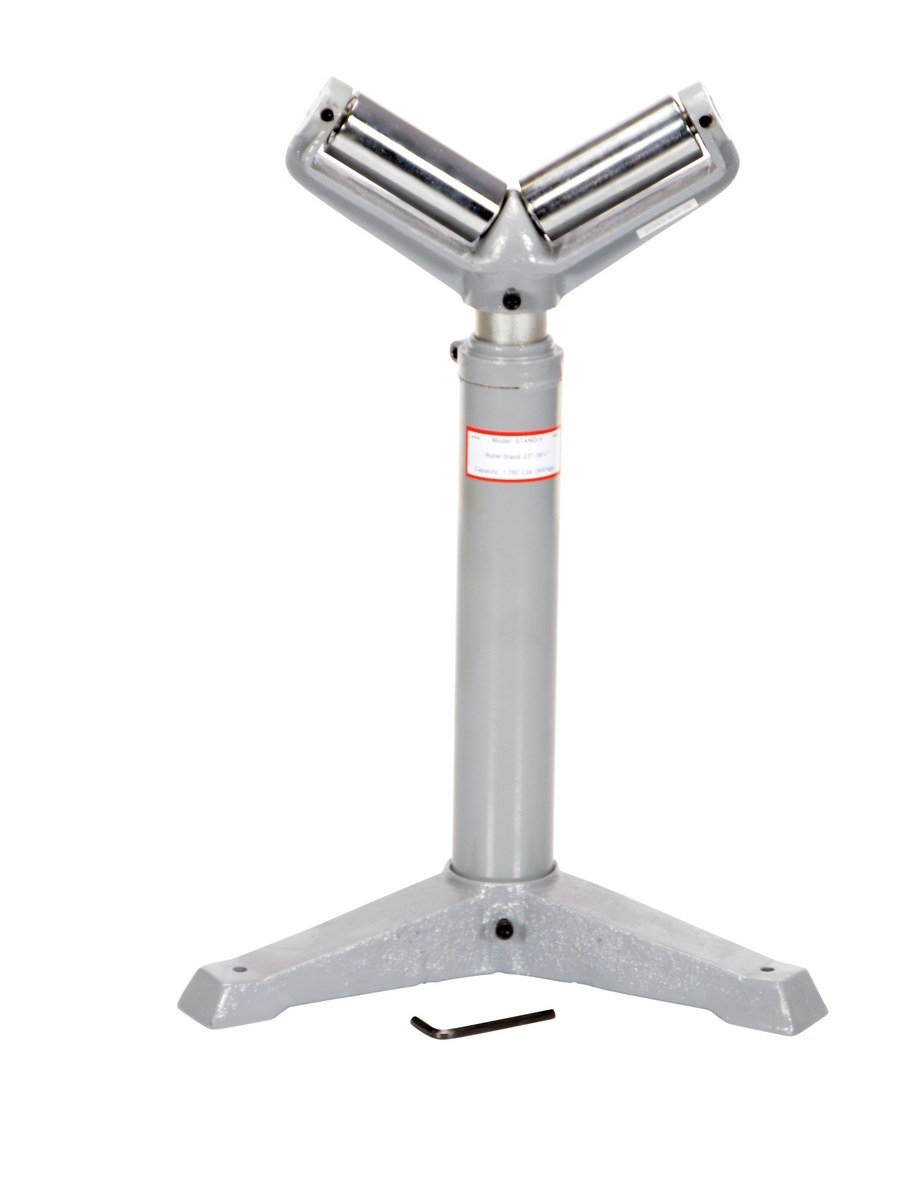 Steel Roller Stand 23-1/2 to 39-1/4 Raised Height 1,760 Lb. Capacity SilverThe deluxe roller stand is designed for use as an extra hand when working with long materials. Each stand includes chrome plated rollers and heavy-duty cast-steel base. This roller stand is a v-groove roller design. The height of each stand is adjusted with a friction lock screw or a gas charged cylinder. The unit is great for use in machine and wood shops.