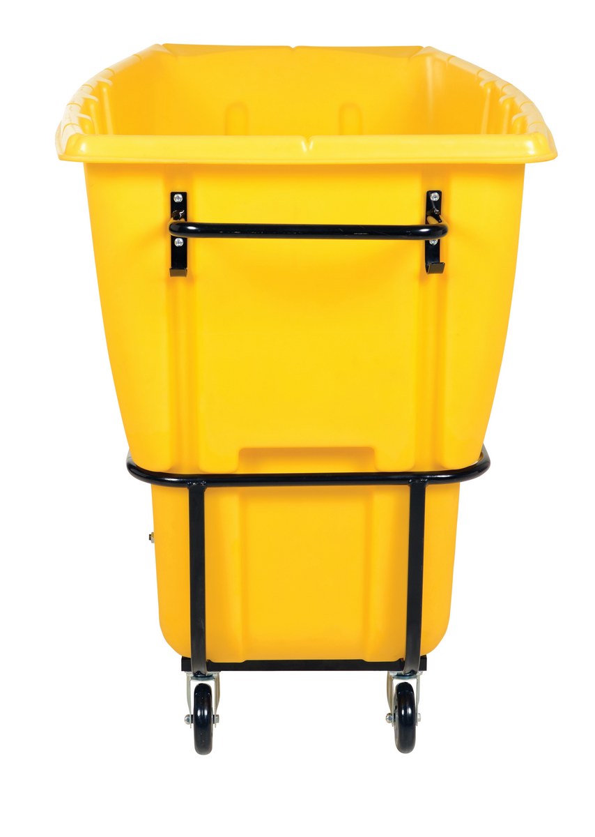 Durable plastic construction allows for collecting waste from multiple bins at a collective time. Great for warehouses, fairs, ball parks, schools, etc. Strong, one-piece molded polyethylene body with steel base tip support and a balanced design to allow for simple dumping by one person. Easily portable on 2 large rubber wheels and two swivel wheels. Not for use with fork trucks. Yellow color design.