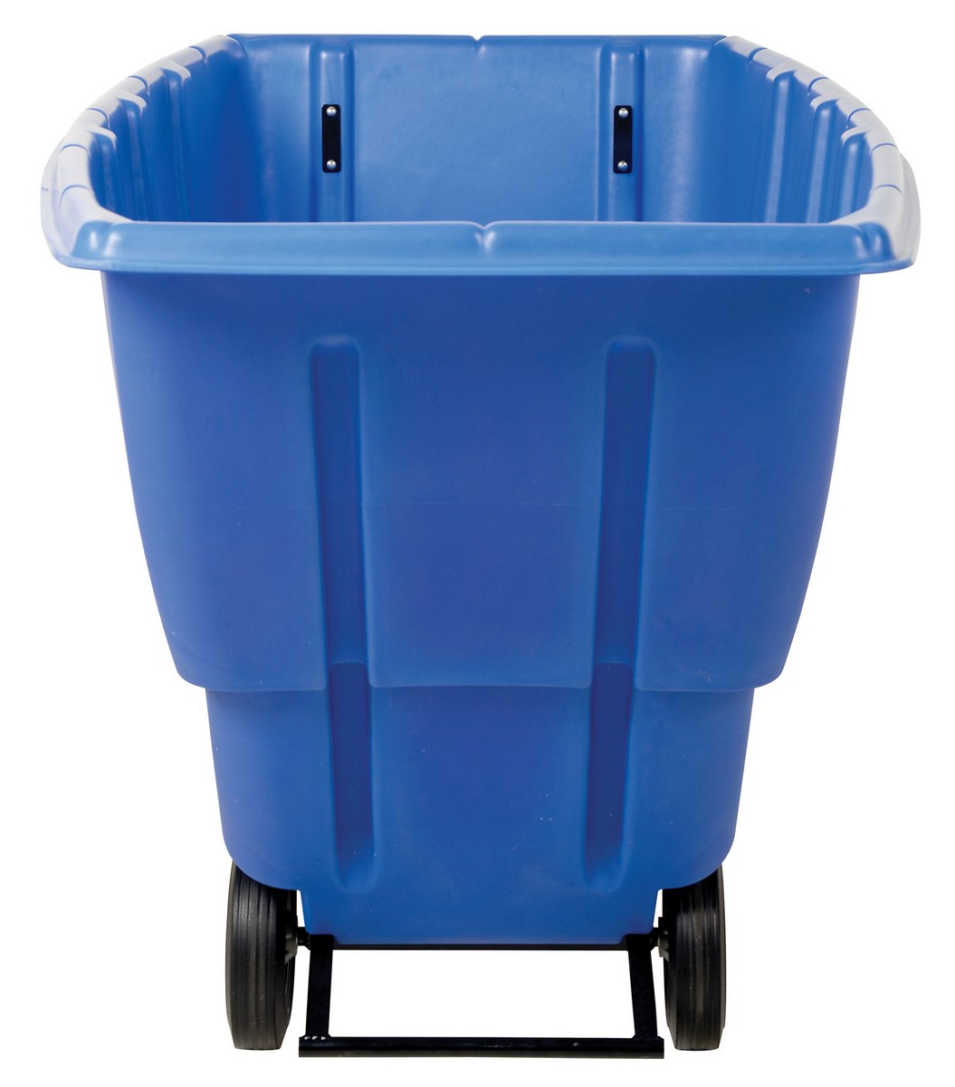 Durable plastic construction allows for collecting waste from multiple bins at a collective time. Great for warehouses, fairs, ball parks, schools, etc. Strong, one-piece molded polyethylene body with steel base tip support and a balanced design to allow for simple dumping by one person. Easily portable on 2 large rubber wheels and two swivel wheels. Not for use with fork trucks. Blue color design.