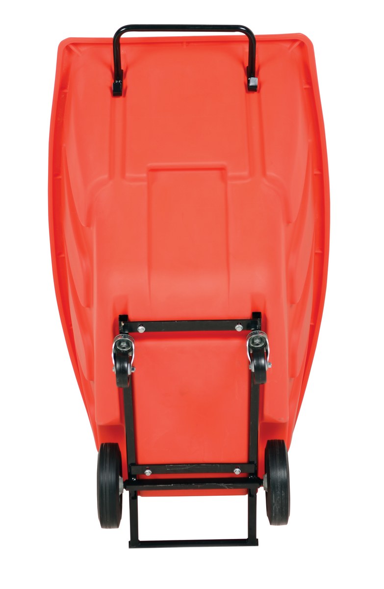 Durable plastic construction allows for collecting waste from multiple bins at a collective time. Great for warehouses, fairs, ball parks, schools, etc. Strong, one-piece molded polyethylene body with steel base tip support and a balanced design to allow for simple dumping by one person. Easily portable on 2 large rubber wheels and two swivel wheels. Not for use with fork trucks. Red color design.