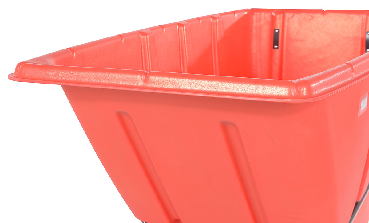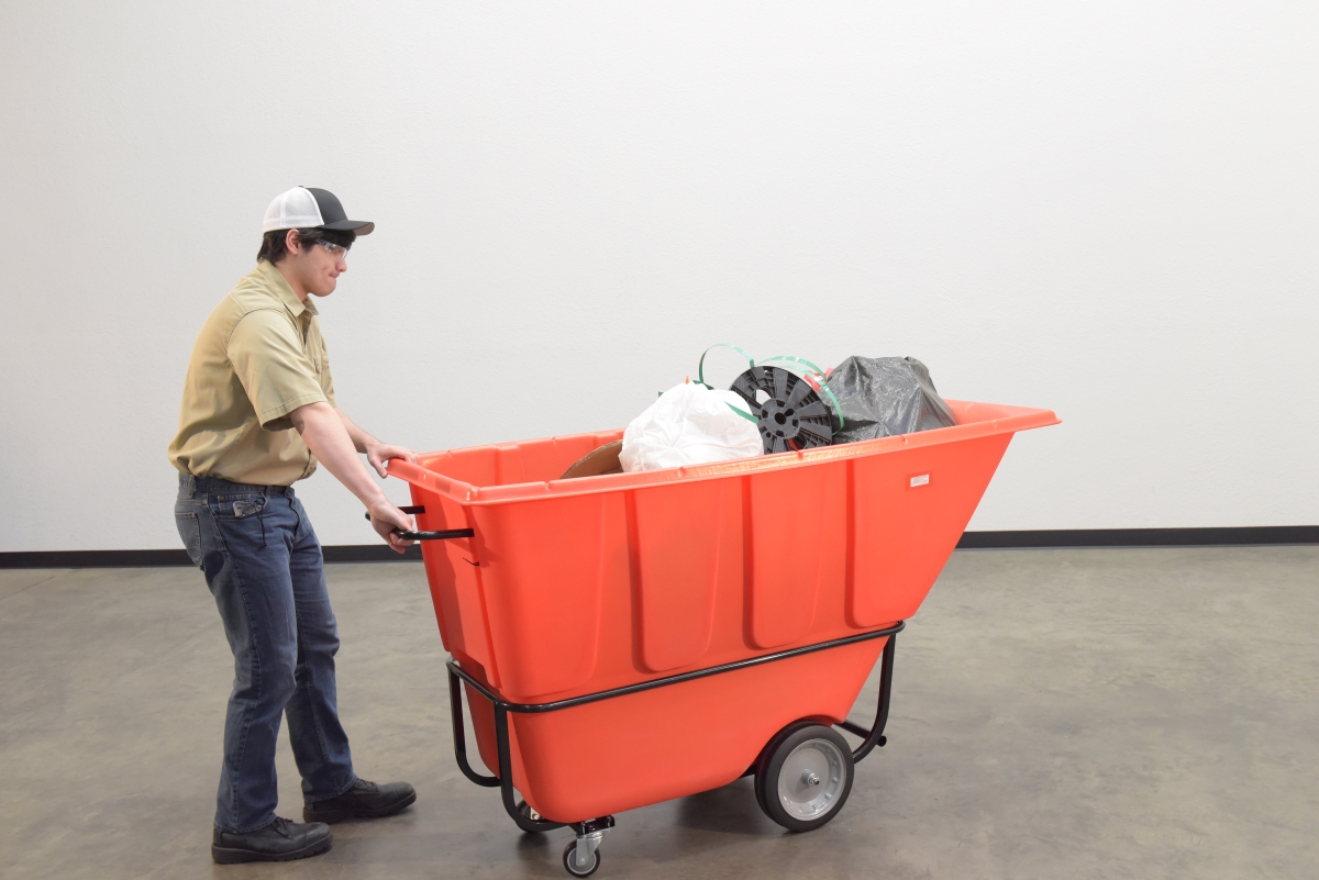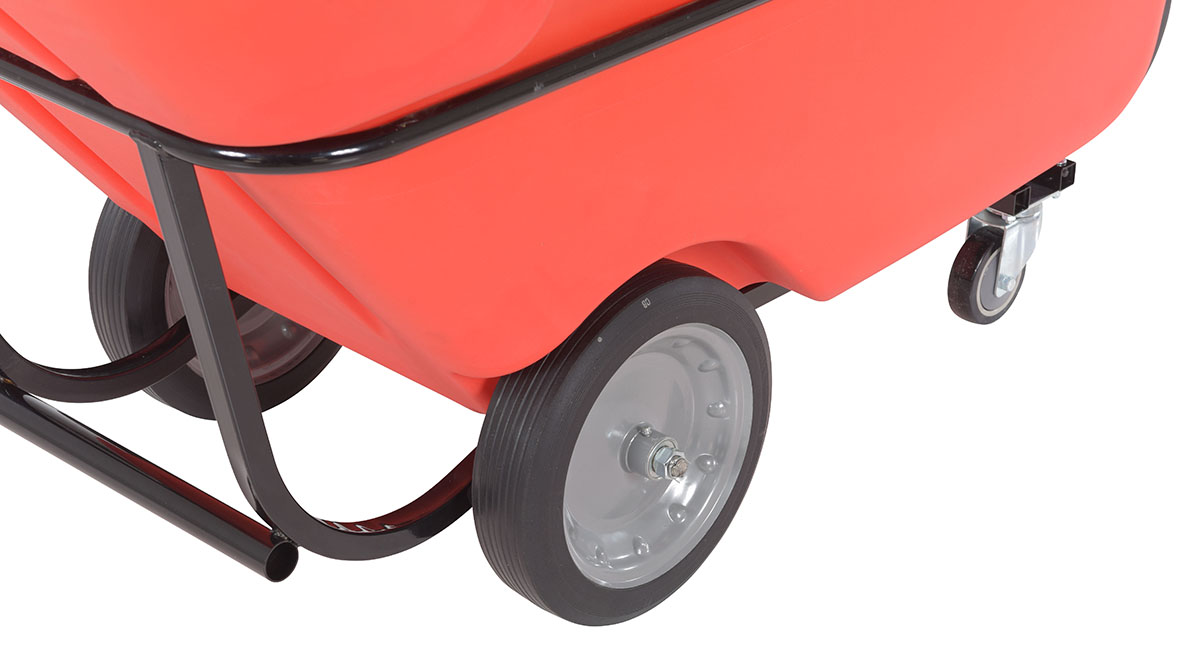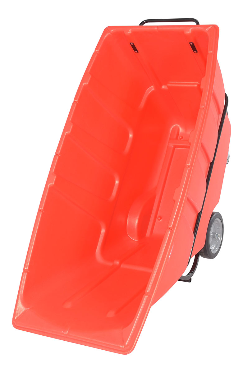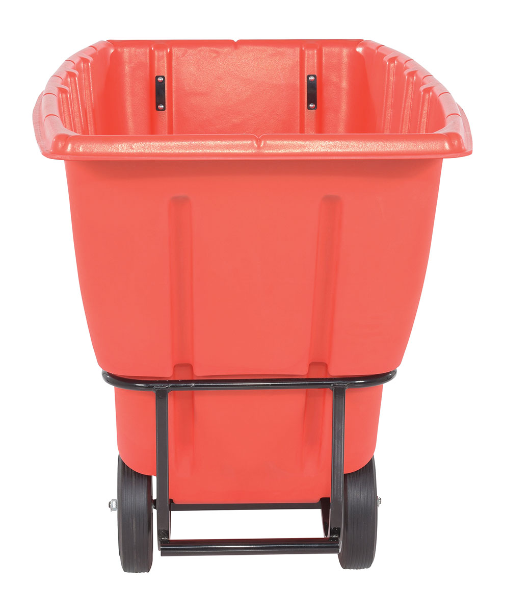 Durable plastic construction allows for collecting waste from multiple bins at a collective time. Great for warehouses, fairs, ball parks, schools, etc. Strong, one-piece molded polyethylene body with steel base tip support and a balanced design to allow for simple dumping by one person. Easily portable on 2 large rubber wheels and two swivel wheels. Not for use with fork trucks. Red color design.