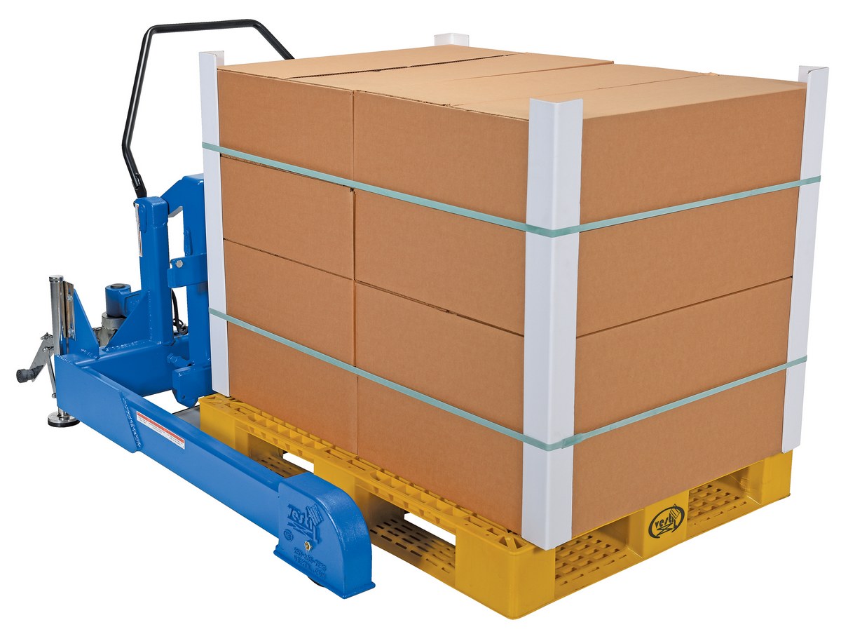 The tilt master straddle lifts and positions filled tote boxes or baskets without the need of a fork truck or lift table using the newly designed heavy-duty tilt master. The tilter will function as transporters by moving completed products from work station to work station without waiting for a fork truck. This lift has a thin profile to allow the user to get as close to the load as possible. It also has a standard floor lock and rolls easily on the phenolic steering wheels. Lift is designed to be used with virtually any kind of container or pallet. The unit is powered by an air pneumatic motor.