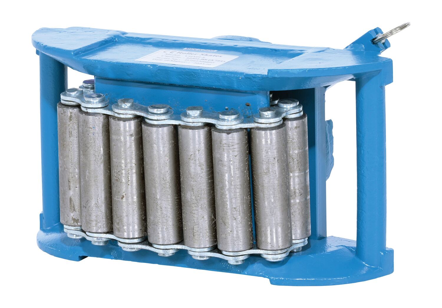 Steel Machine Roller 8,250 Lb. Capacity BlueMade of high-strength annealed ductile iron, this steel machine roller has swivel tops that rotate three hundred sixty degrees (360 degrees) on chrome steel ball bearings to allow for easier turning. The rollers form a "tank track" to revolve around a center load bearing plate in the frame to provide maximum maneuverability. The weight of the load is transferred directly from the load bearing plate to the rollers, eliminating axle friction and requiring less power to start and move. This unit is virtually maintenance free.