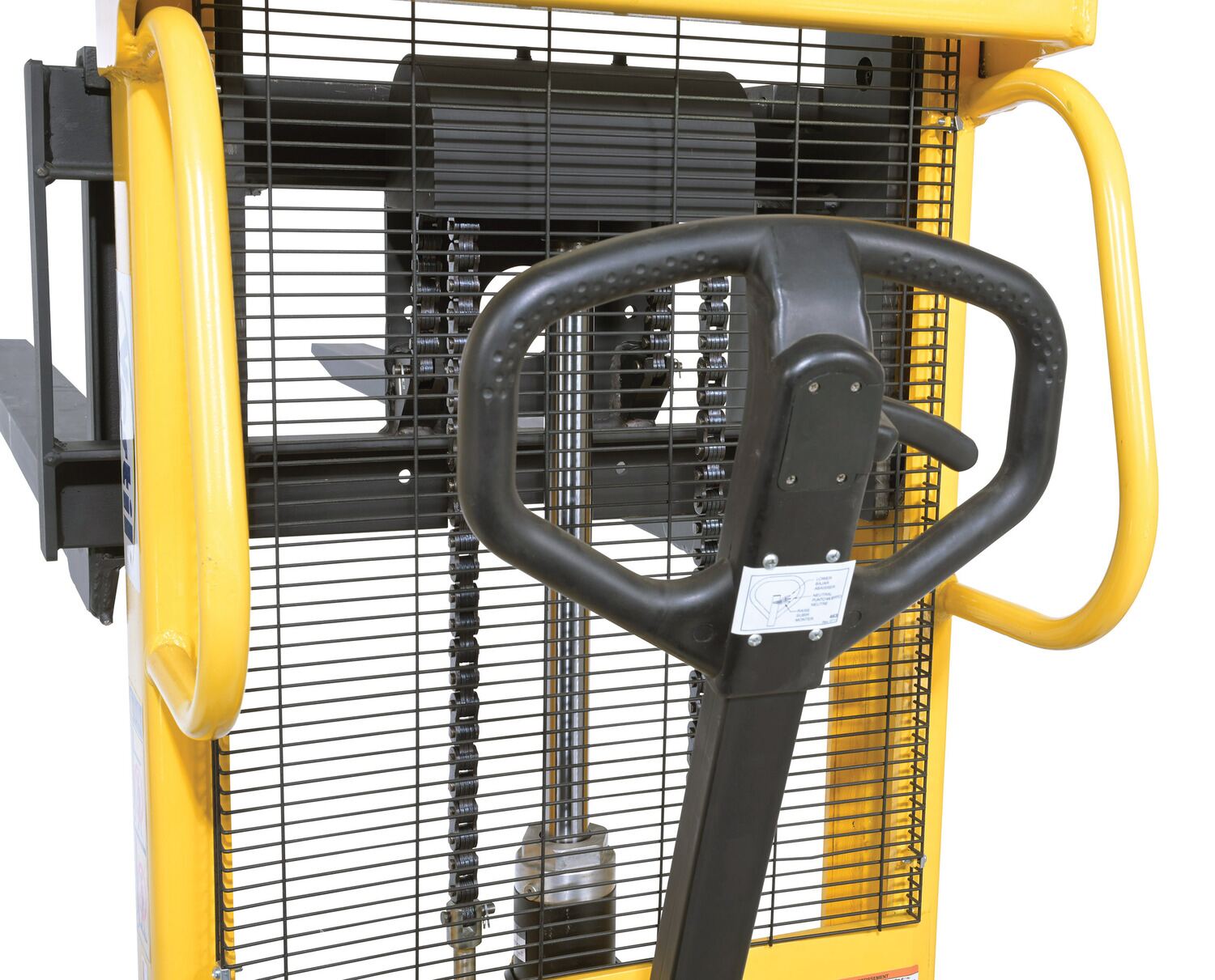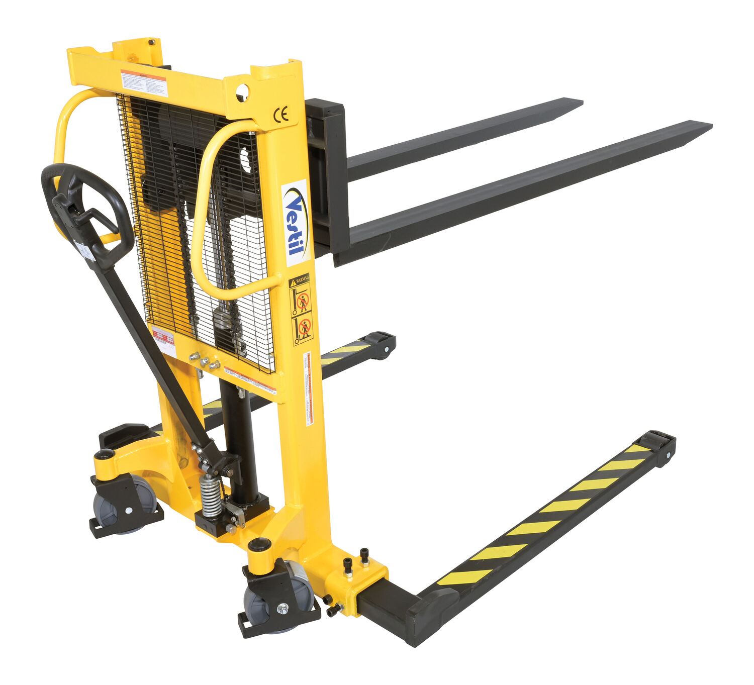 Steel Manual Stacker Adjustable Forks/Legs 550 Lb. Capacity Black / YellowThe manual stacker is designed to meet the most challenging tasks. Ideal for use in various workstation and workplace applications. The full height push handle allows for easy steering and excellent visibility through a welded mesh guard with an optional removable platform also available. It features a heavy-duty mast and a unique winch design for easier and safer lifting. The lifting and lowering is completed by a manual hand pump operation.