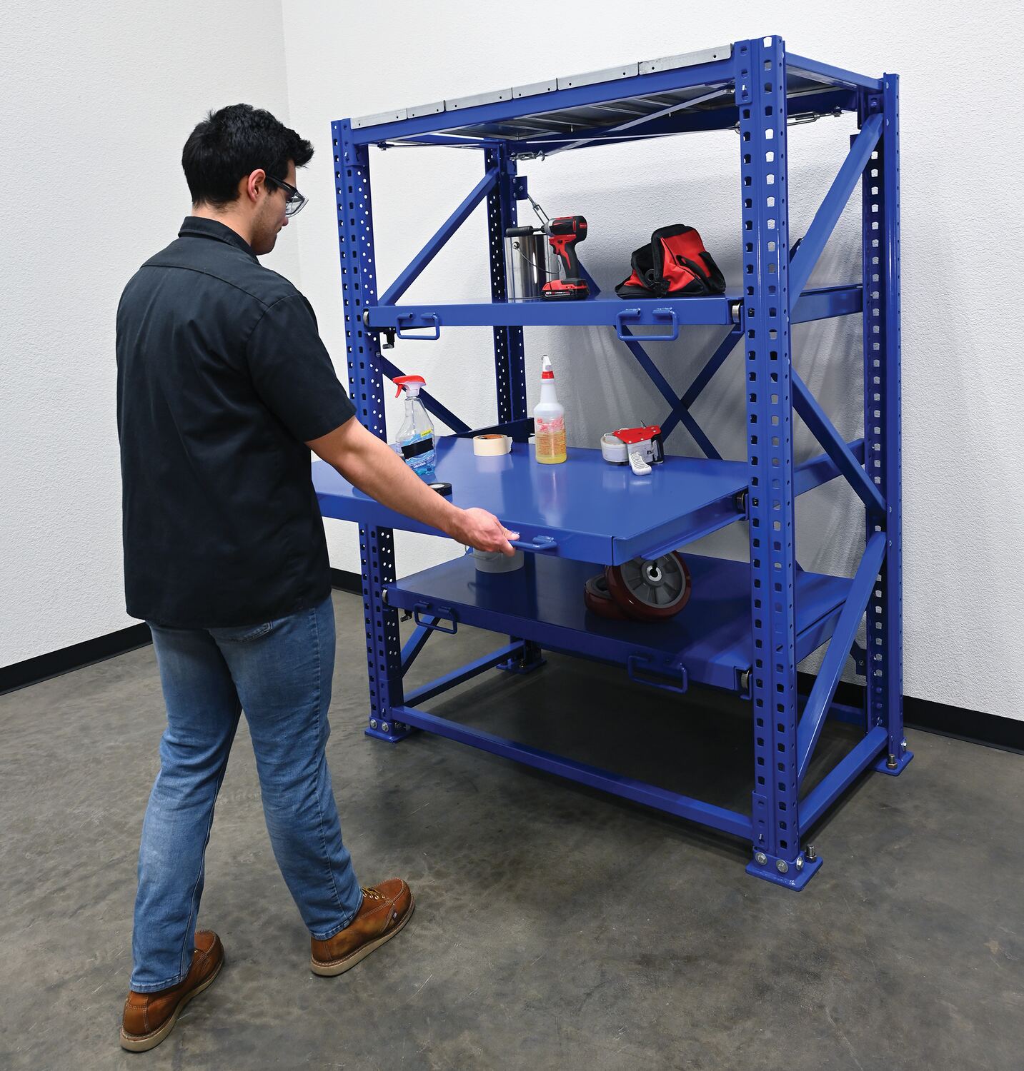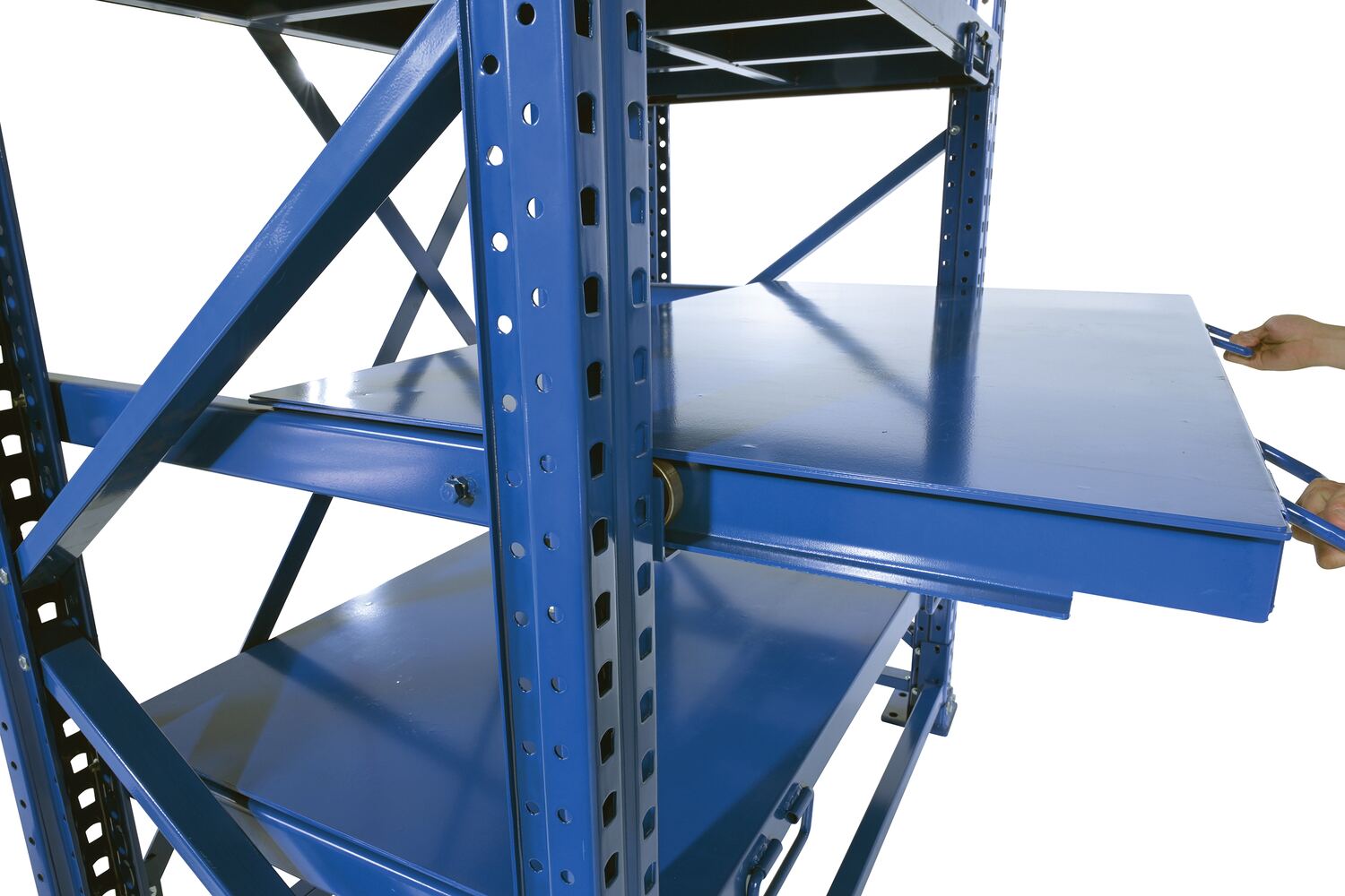 Steel Heavy Duty Roll-Out Shelving 32L X 60W X 80H 3,000 Lb. Capacity BlueHeavy Duty roll-out shelving supports and stores heavy dies, fixtures and machinery. Shelves should be rolled out one at a time for simple product placement, as well as, personnel safety. All steel construction with powder coat finish. Mounting holes are pre drilled. Assembly hardware is included. Mounting hardware is available separately.