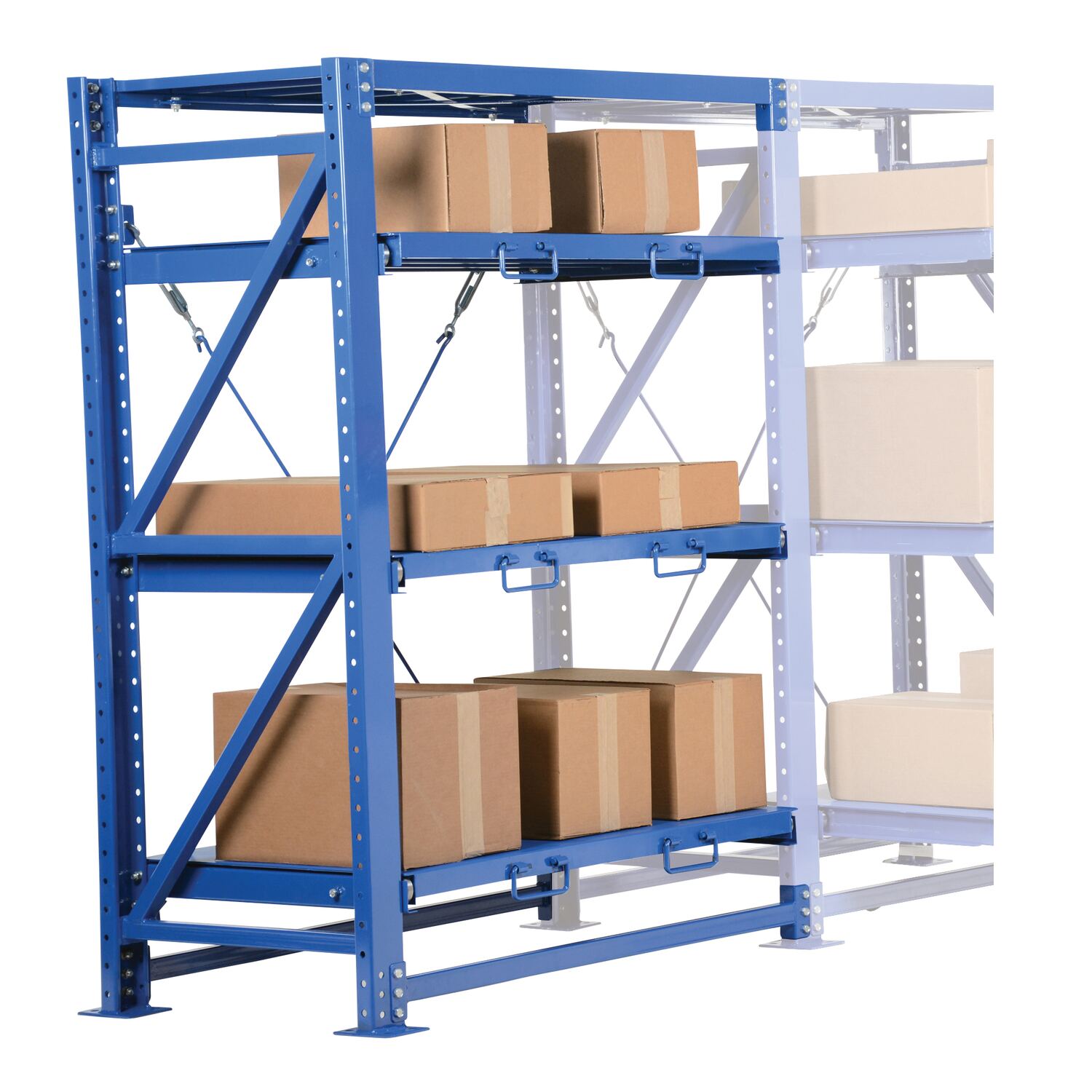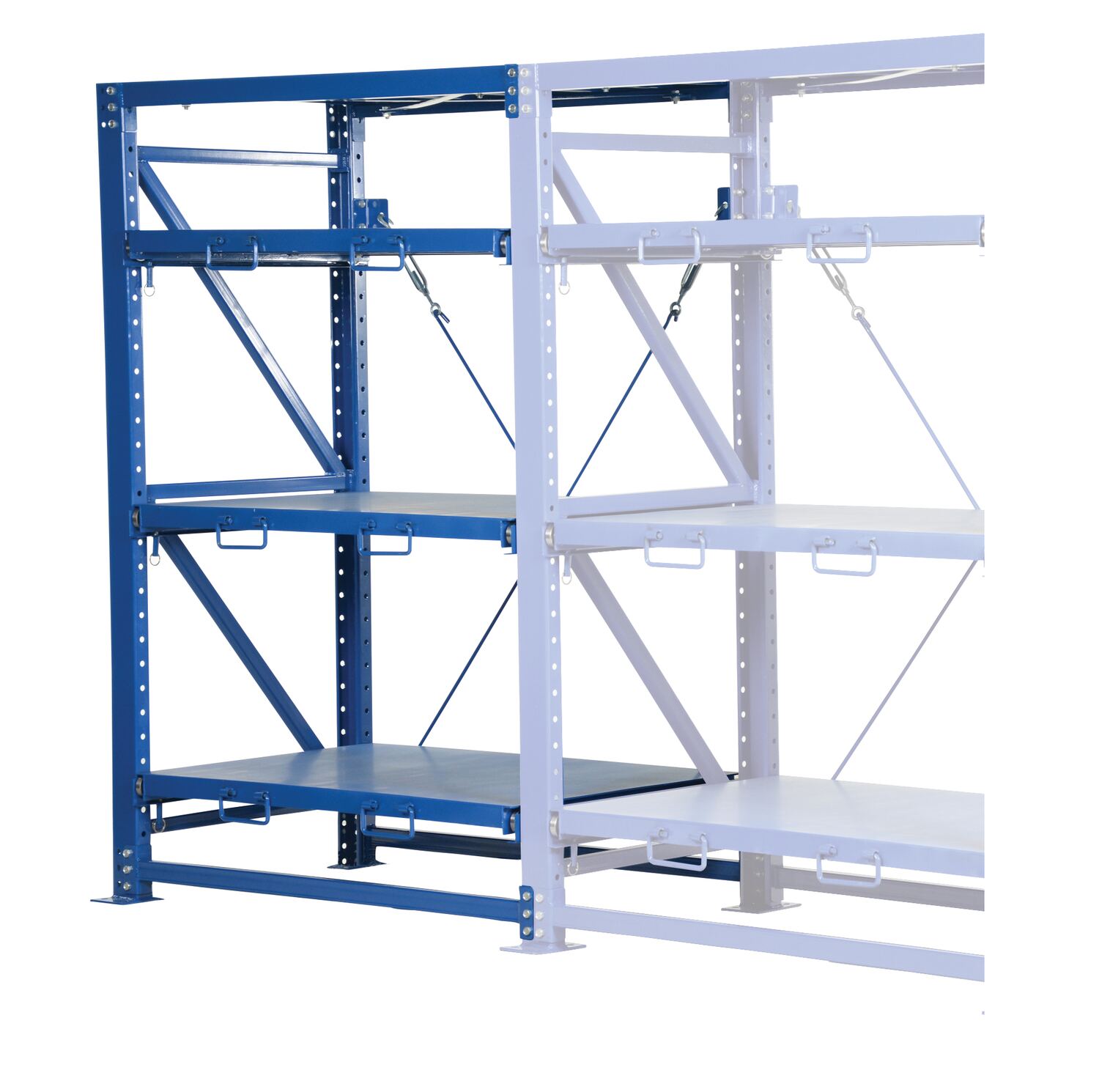 Steel Roll Out Shelving-Add On Unit 32"l X 57"w X 80"h 3,000 Lb. Capacity BlueHeavy Duty roll-out shelving add on unit is an excellent choice to support and store large items such as dies, fixtures and machinery. Shelves should be rolled out one at a time for simple product placement, as well as, personnel safety. All steel construction with powder coat finish. Mounting holes are pre drilled. Assembly hardware is included. Mounting hardware is available separately.