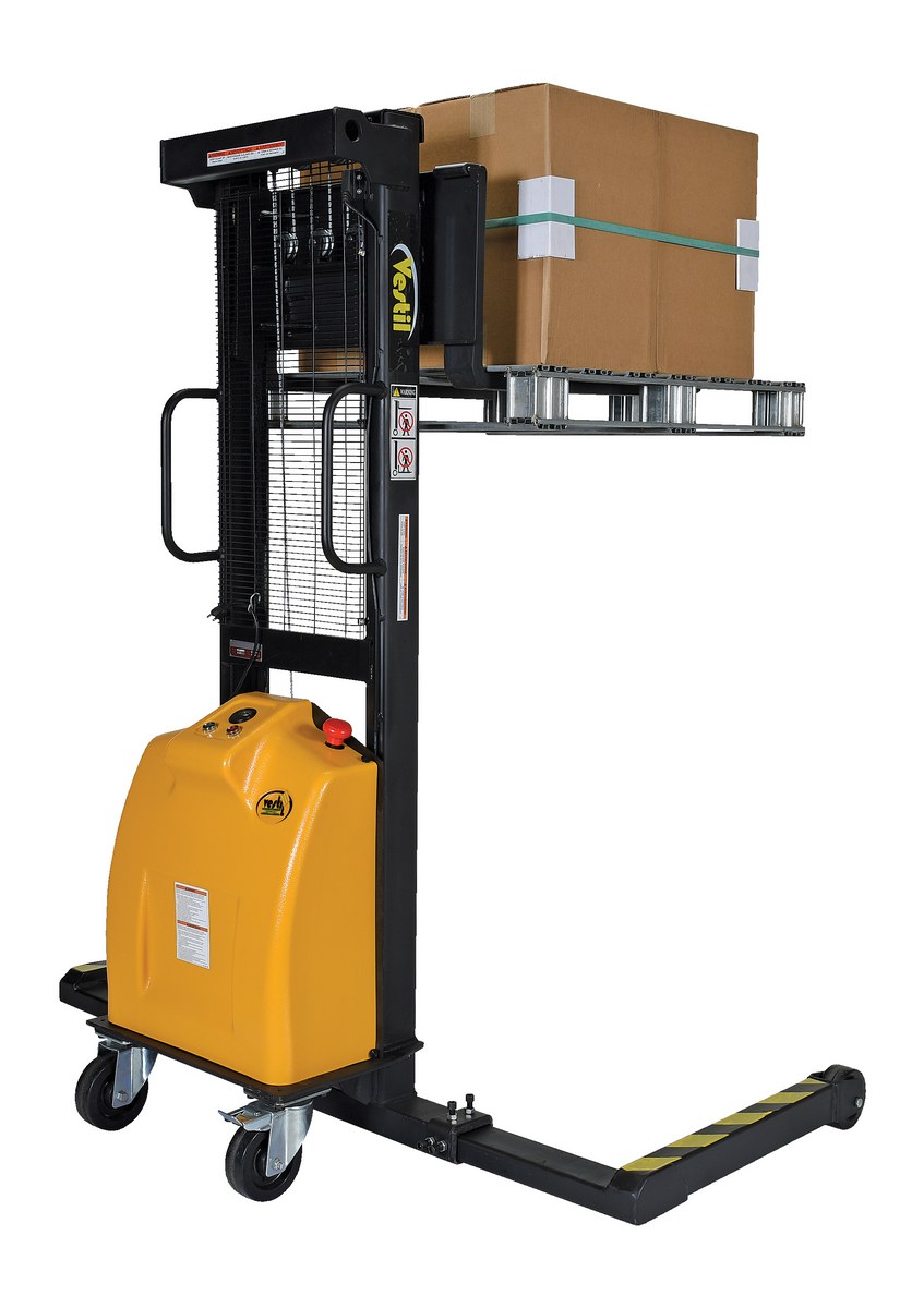 Steel Stacker with Adjustable DC Powered Winch 770 Lb. Capacity Black / YellowThe electric winch stacker features a heavy duty mast and a DC winch for easier and safer lifting. Lift and lower by DC winch and steel cable mechanism. A full height push-handle is included for easy steering and excellent visibility through welded mesh guard. The unit rolls smoothly on two rigid and two swivel wheels with brakes for easy maneuvering.