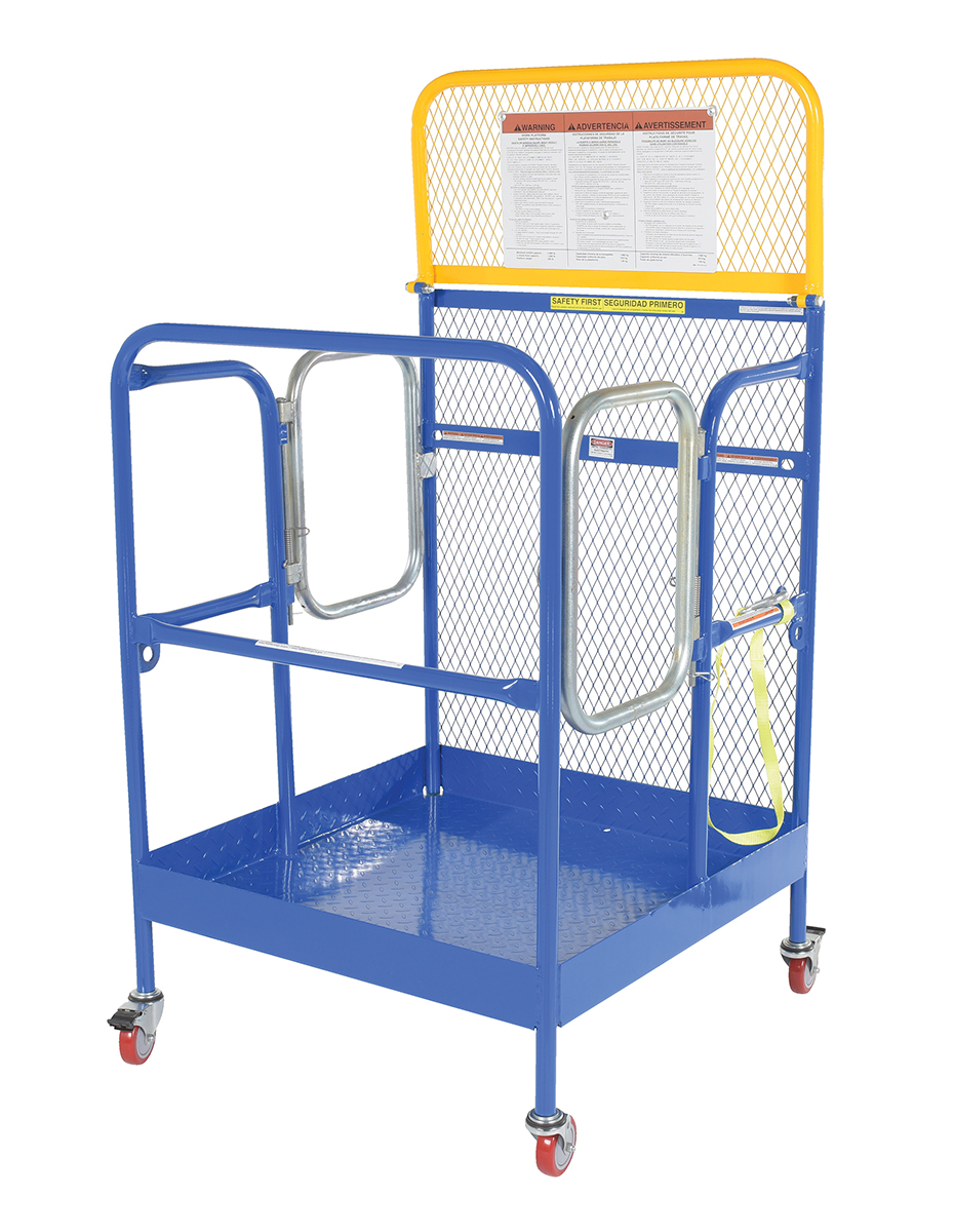 This convenient fork truck work platform quickly and safely raises maintenance personnel where they are needed. Attaches to fork truck by inserting forks into fork pockets and securing platform to fork truck. Fork locks secure platform to forks. Dual handrails on three (3) sides with expanded metal backing on the fourth side. Includes checker floor plate platform and long strap with hook to attach platform to fork truck. A maximum of two (2) people can be in the work platform at one time.