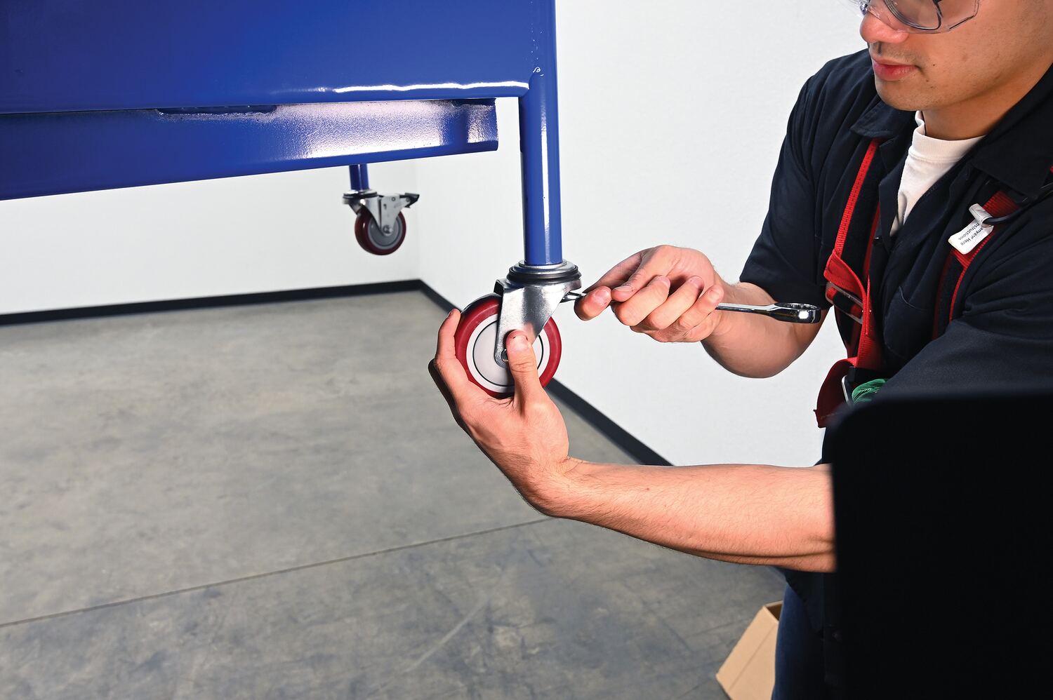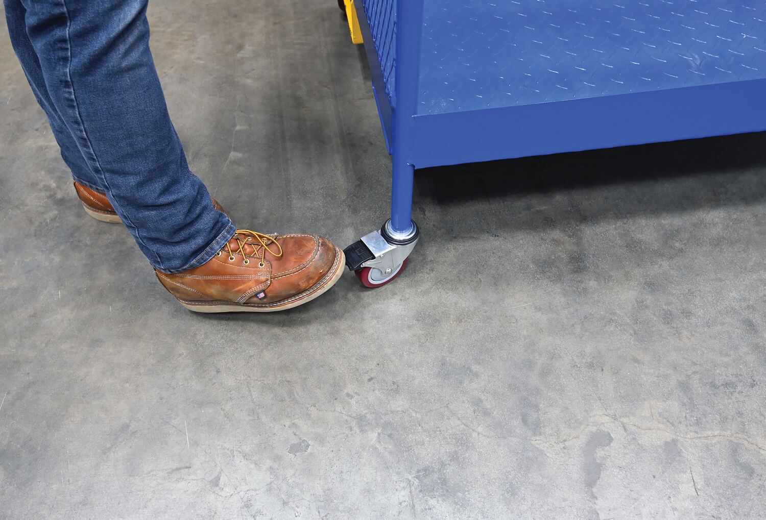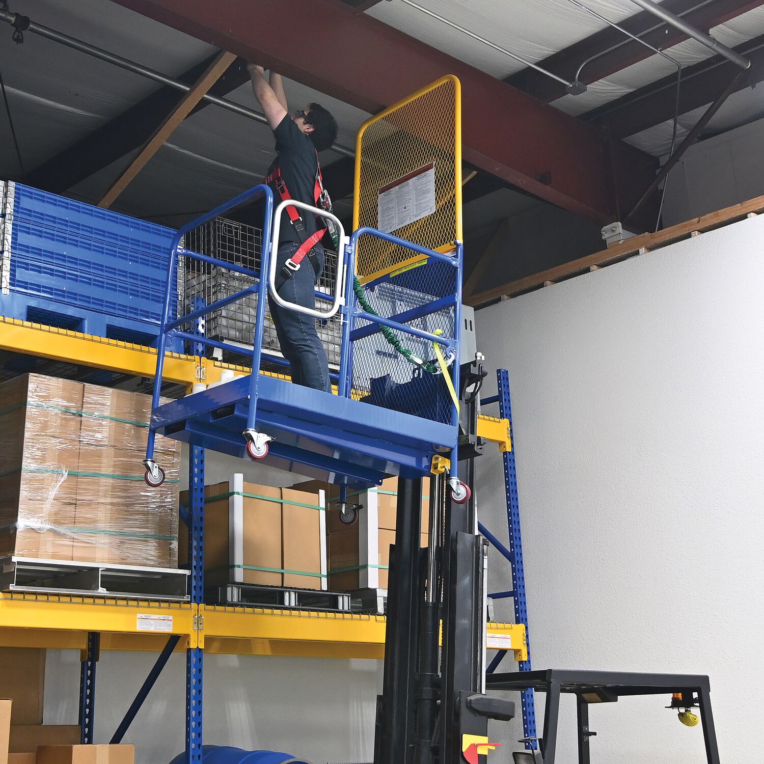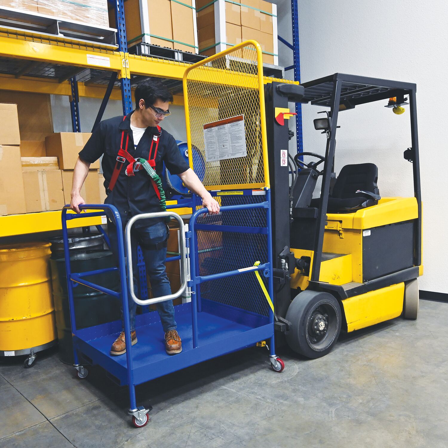 Steel Work Platform With Poly Casters and 84 In. Expanded Back 36 In. x 48 In. 1,000 Lb. Capacity BlueThis convenient fork truck work platform quickly and safely raises maintenance personnel where they are needed. Attaches to fork truck by inserting forks into fork pockets and securing platform to fork truck. Fork locks secure platform to forks. Dual handrails on three (3) sides with expanded metal backing on the fourth side. Includes checker floor plate platform and long strap with hook to attach platform to fork truck. A maximum of two (2) people can be in the work platform at one time. Includes (4) four poly swivel casters. Meets California OSHA specifications.